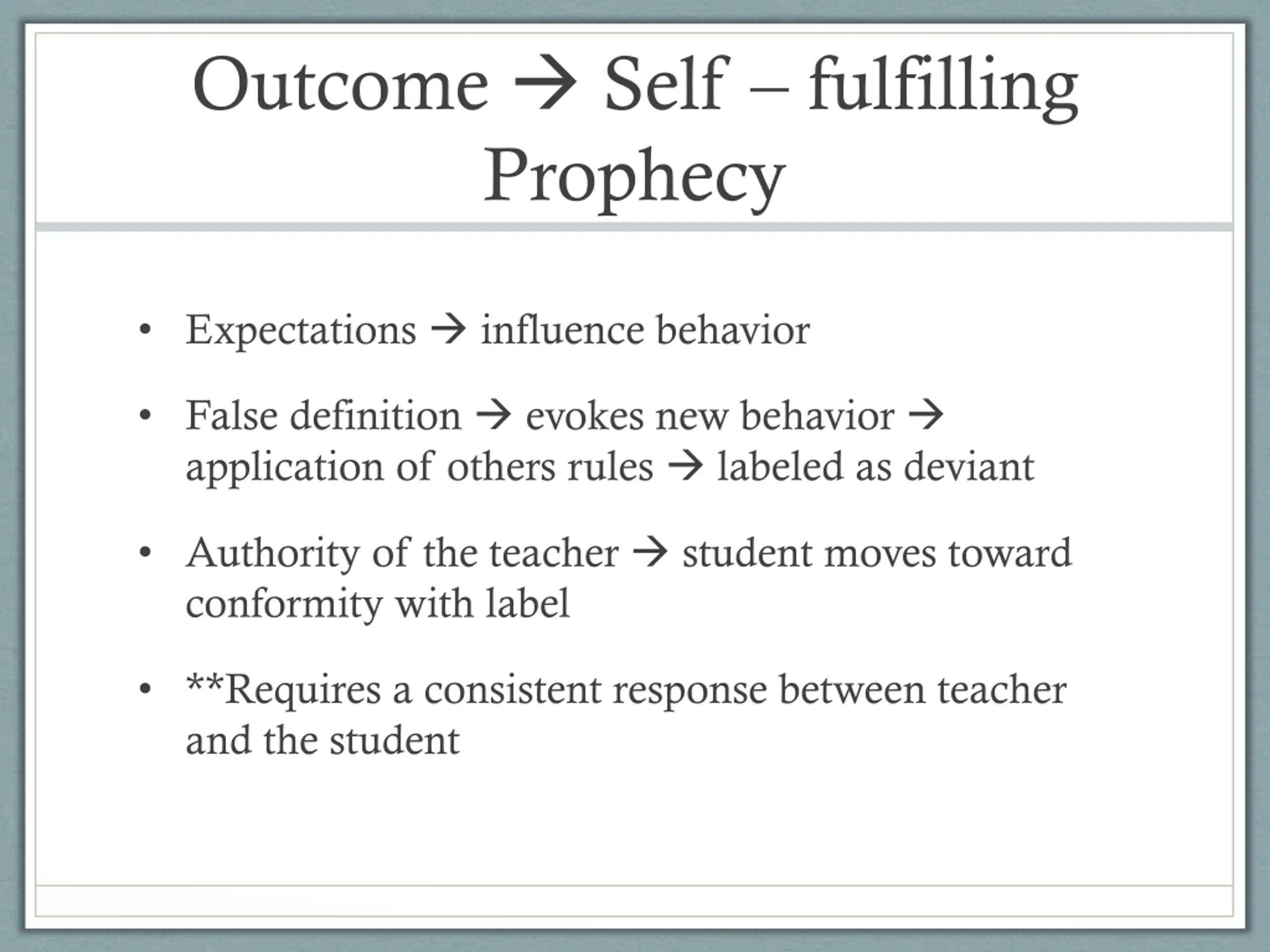 Outcome Self fulfilling Prophecy Expectations influence behavior False definition evokes new behavior application of others rules labeled as deviant Authority of the teacher student moves toward conformity with label **Requires a consistent response between teacher and the student