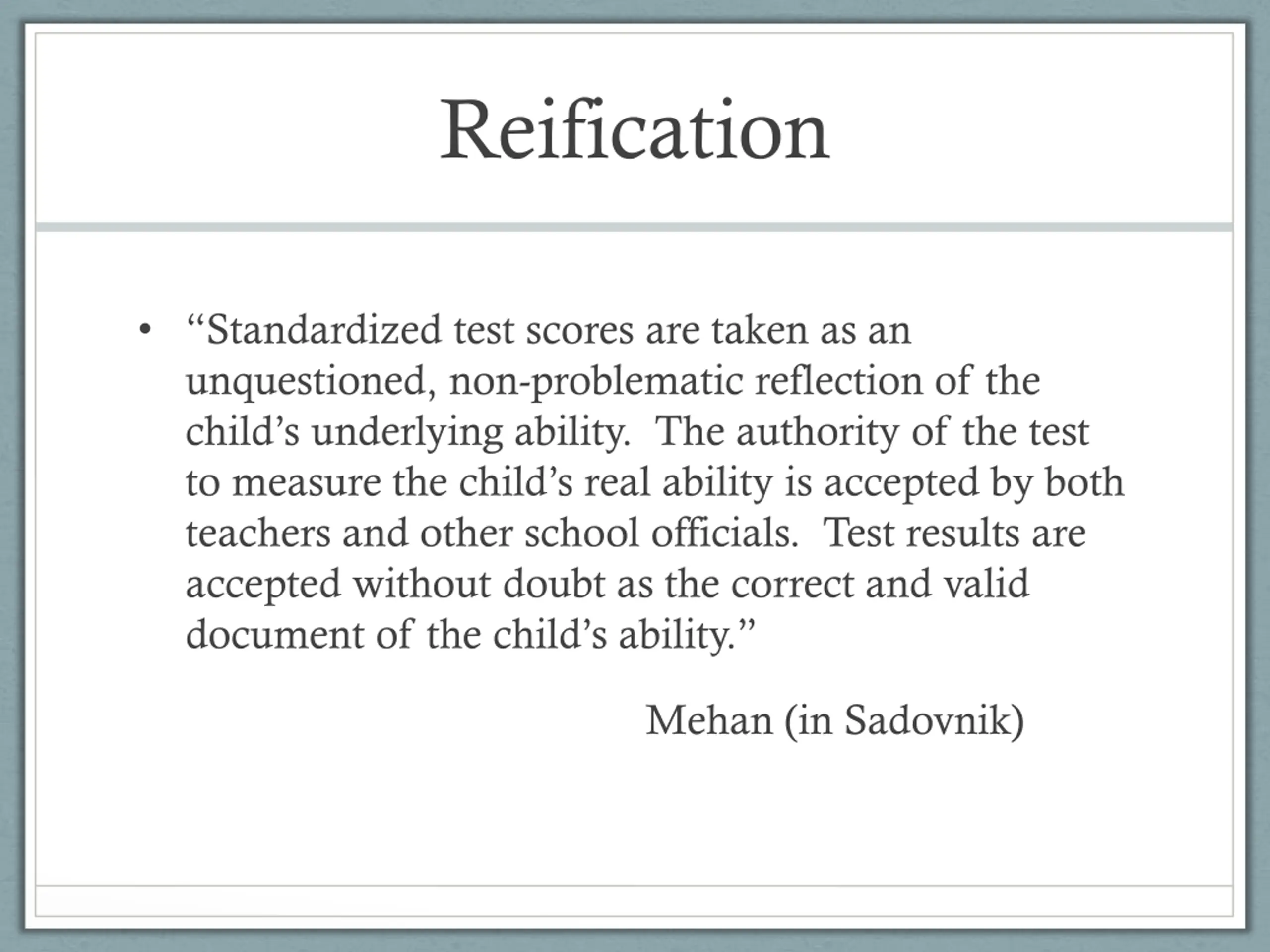 Reification Standardized test scores are taken as an unquestioned, non-problematic reflection of the child s underlying ability. The authority of the test to measure the child s real ability is accepted by both teachers and other school officials. Test results are accepted without doubt as the correct and valid document of the child s ability. Mehan (in Sadovnik)