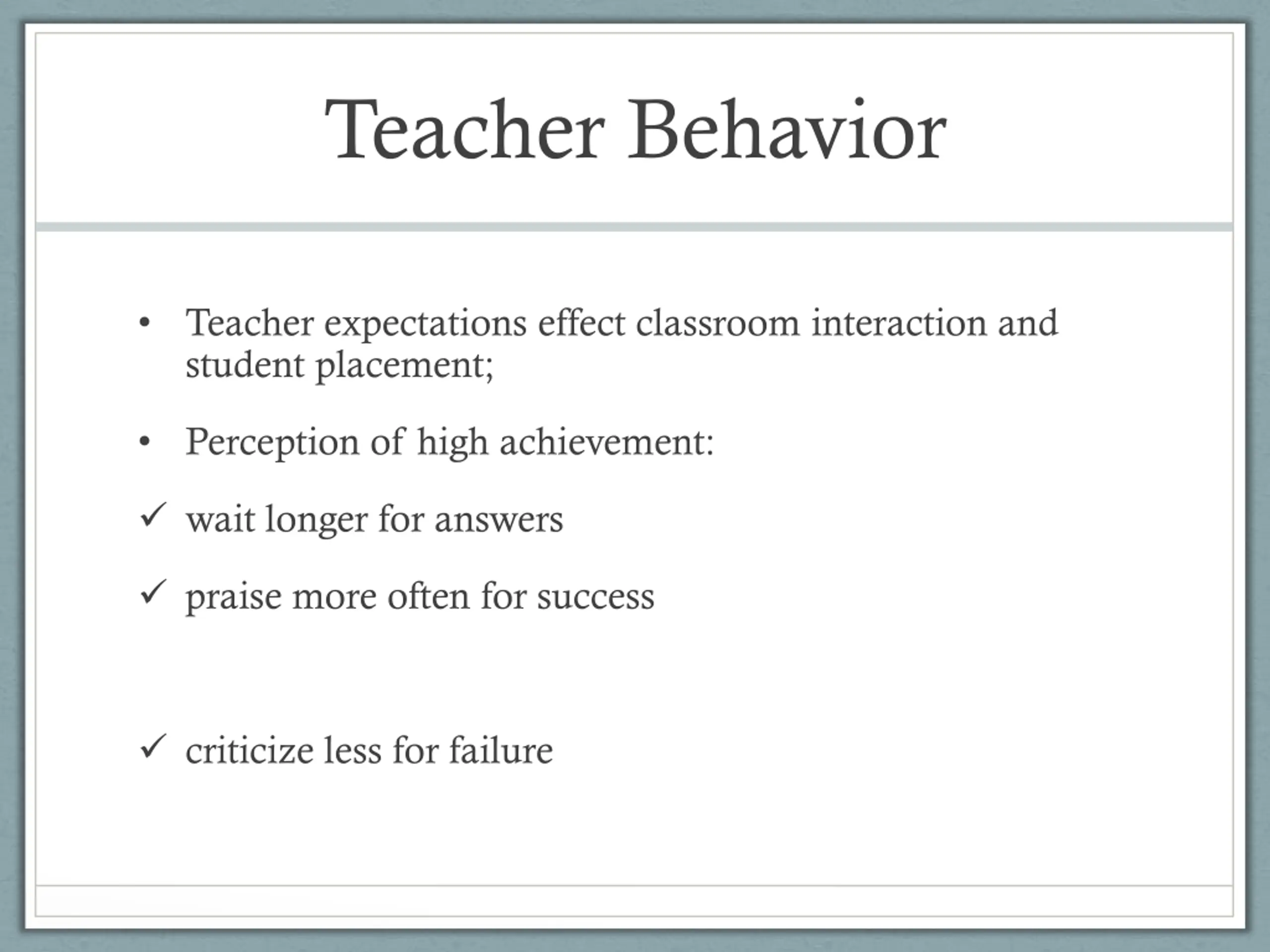 Teacher Behavior Teacher expectations effect classroom interaction and student placement; Perception of high achievement: wait longer for answers praise more often for success criticize less for failure