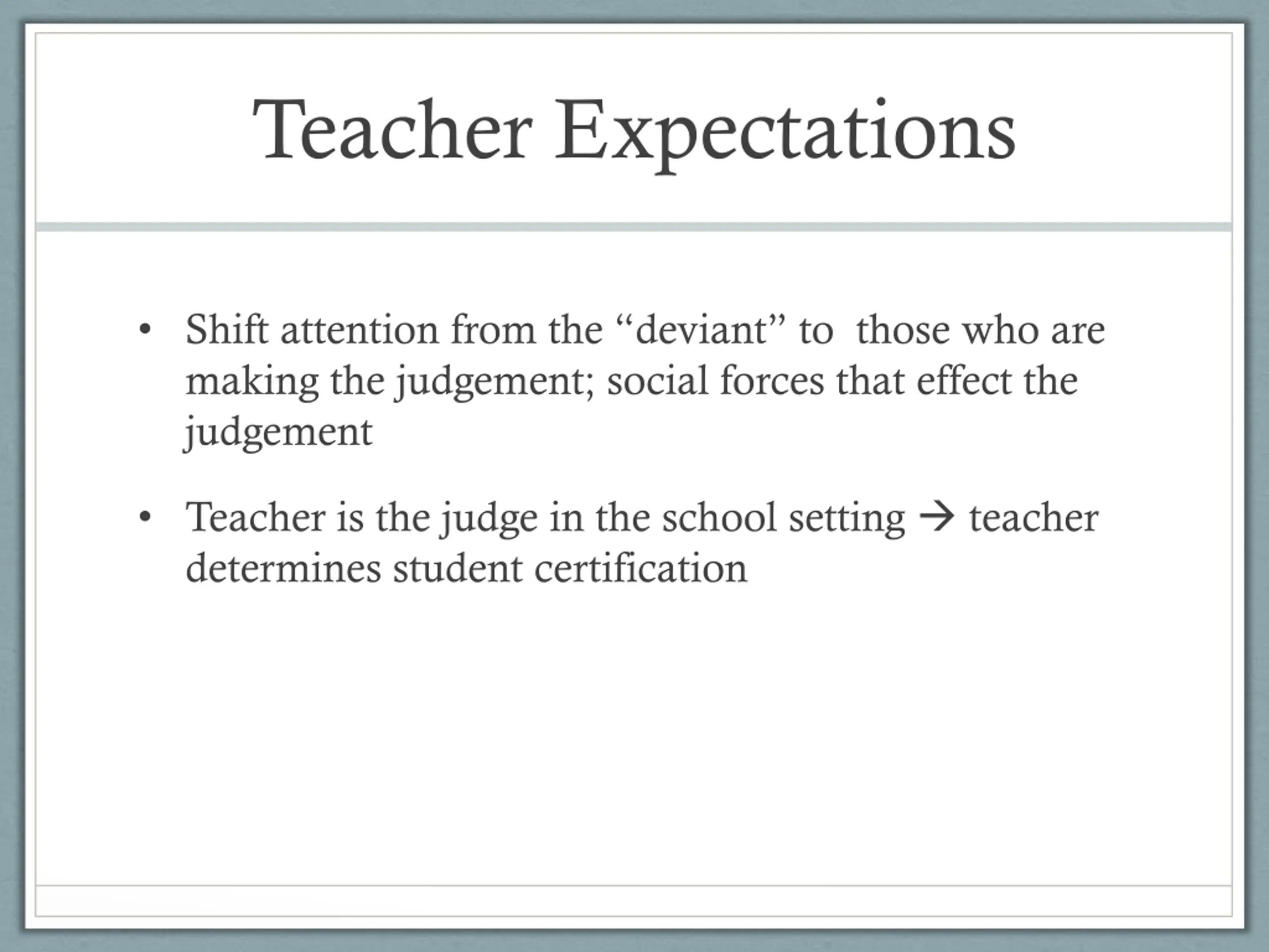 Teacher Expectations Shift attention from the deviant to those who are making the judgement; social forces that effect the judgement Teacher is the judge in the school setting teacher determines student certification