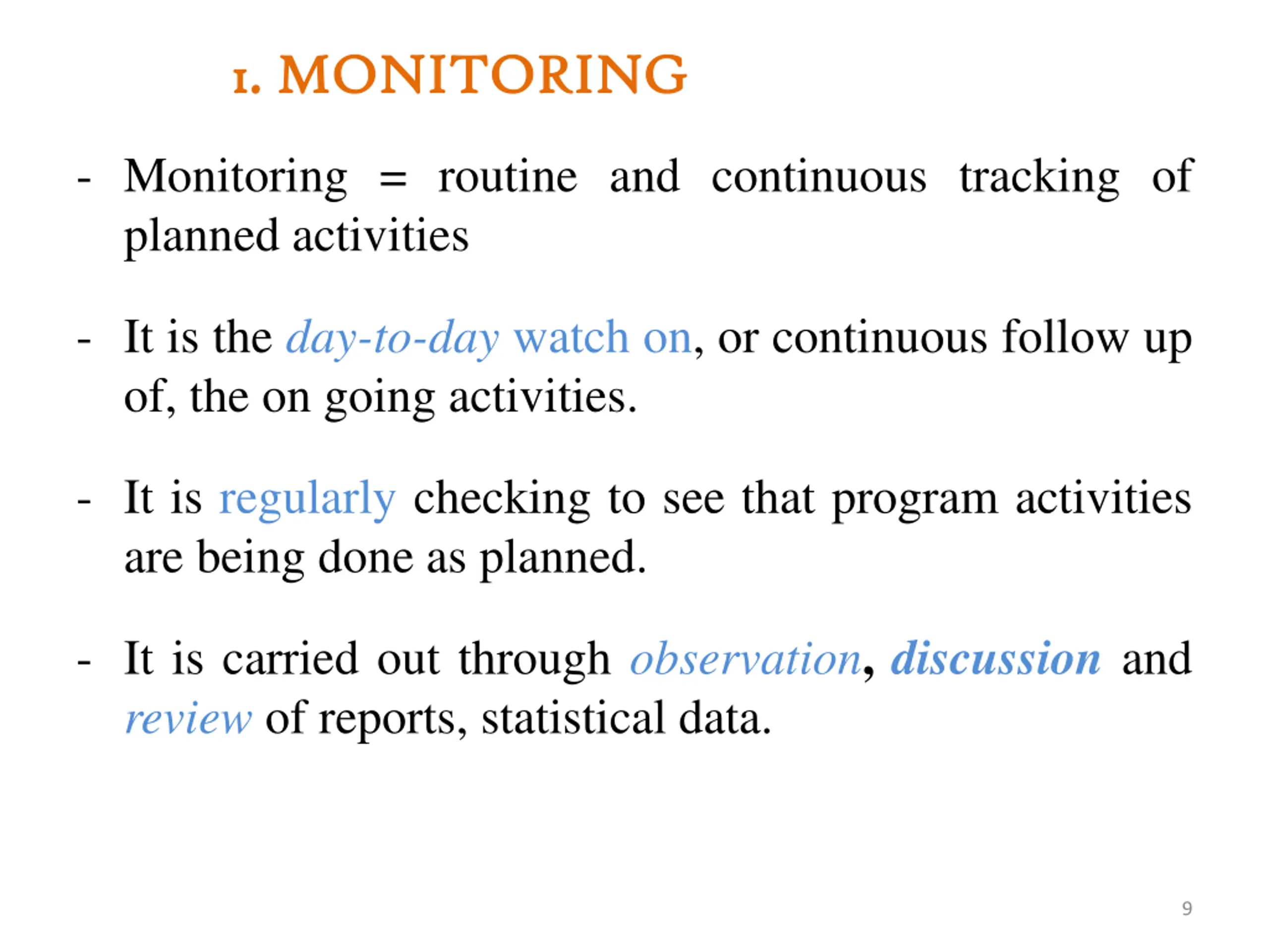 1. MONITORING 1. MONITORING - Monitoring = routine and continuous tracking of planned activities - It is the day-to-day watch on, or continuous follow up of, the on going activities. - It is regularly checking to see that program activities are being done as planned. - It is carried out through observation, discussionand review of reports, statistical data. 9