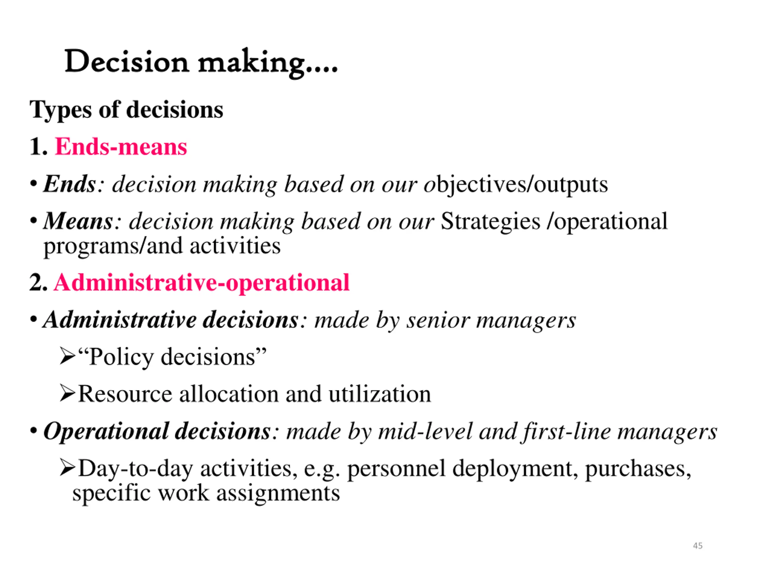 Decision making. Decision making . Types of decisions 1. Ends-means Ends: decision making based on our objectives/outputs Means: decision making based on our Strategies /operational programs/and activities 2. Administrative-operational Administrative decisions: made by senior managers Policy decisions Resource allocation and utilization Operational decisions: made by mid-level and first-line managers Day-to-day activities, e.g. personnel deployment, purchases, specific work assignments 45