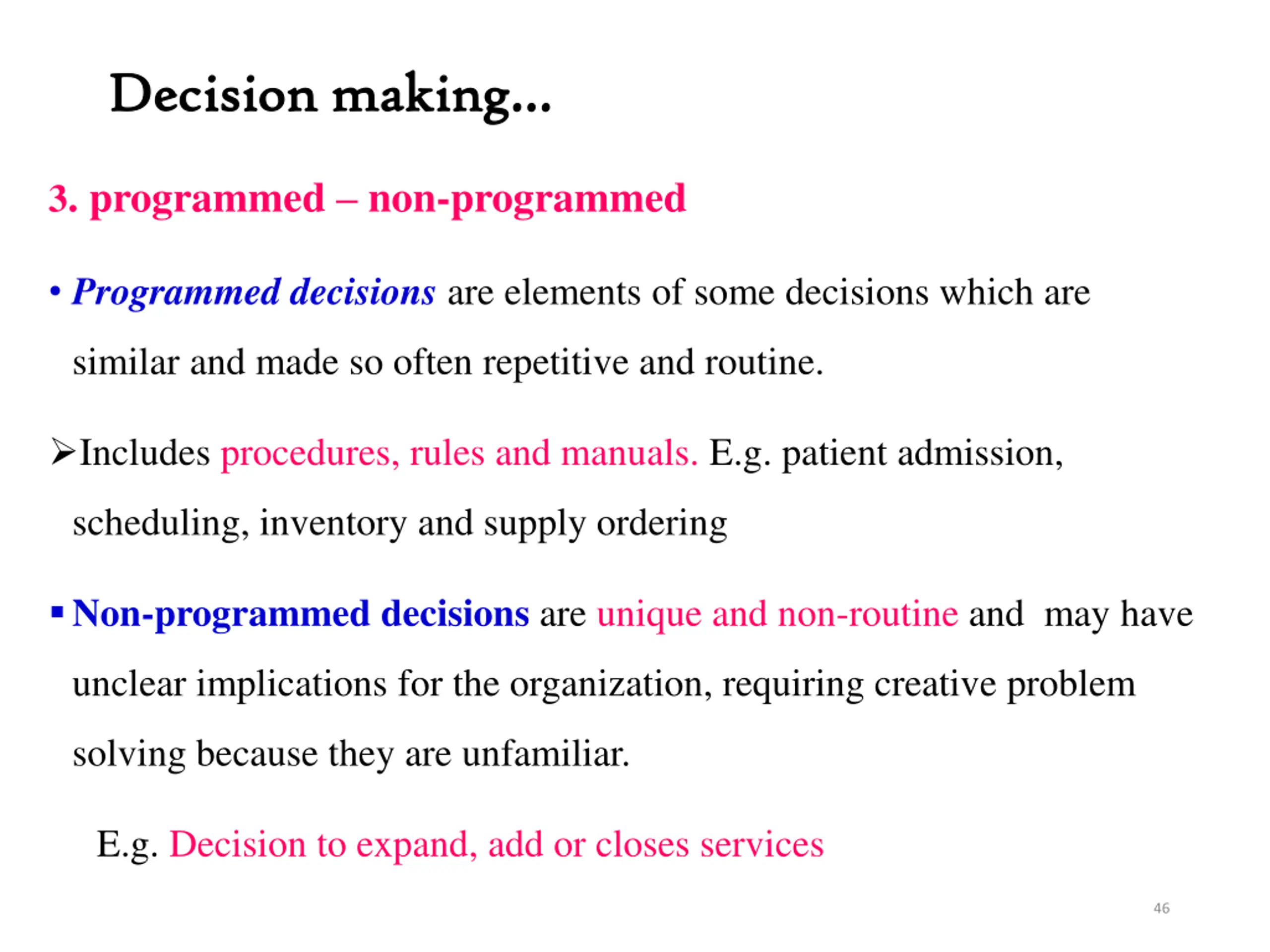 Decision making Decision making 3. programmed non-programmed Programmed decisions are elements of some decisions which are similar and made so often repetitive and routine. Includes procedures, rules and manuals. E.g. patient admission, scheduling, inventory and supply ordering Non-programmed decisions are unique and non-routine and may have unclear implications for the organization, requiring creative problem solving because they are unfamiliar. E.g. Decision to expand, add or closes services 46