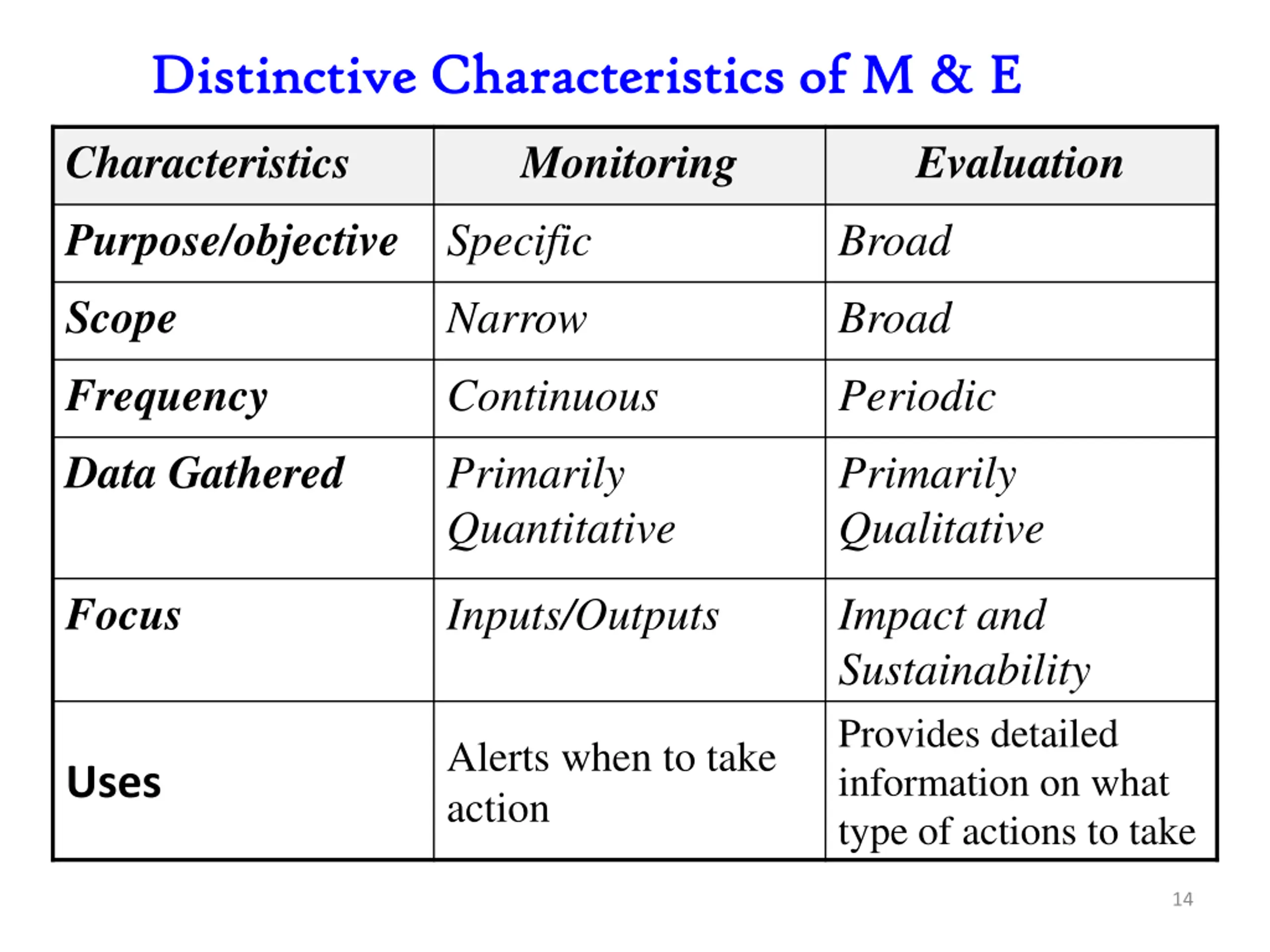 Distinctive Characteristics of M & E Distinctive Characteristics of M & E Characteristics Monitoring Evaluation Purpose/objective Specific Broad Scope Narrow Broad Frequency Continuous Periodic Data Gathered Primarily Quantitative Primarily Qualitative Focus Inputs/Outputs Impact and Sustainability Provides detailed information on what type of actions to take Alerts when to take action Uses 14
