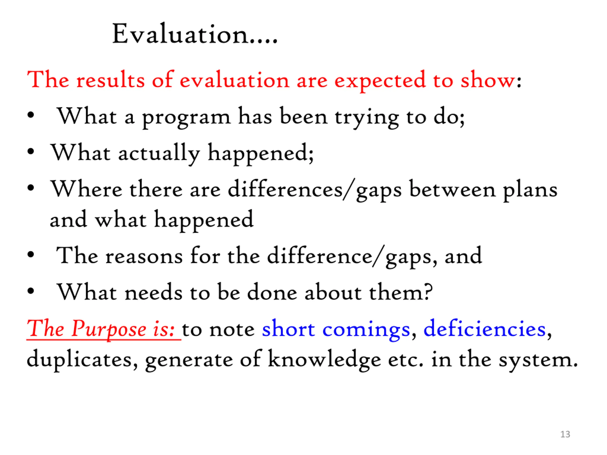 Evaluation. The results of evaluation are expected to show: What a program has been trying to do; What actually happened; Where there are differences/gaps between plans and what happened The reasons for the difference/gaps, and What needs to be done about them? The Purpose is: to note short comings, deficiencies, duplicates, generate of knowledge etc. in the system. 13