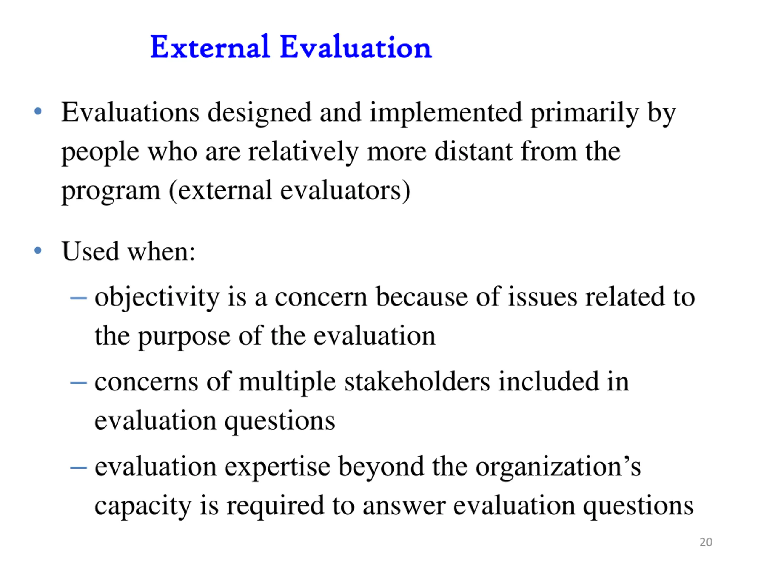 External Evaluation External Evaluation Evaluations designed and implemented primarily by people who are relatively more distant from the program (external evaluators) Used when: objectivity is a concern because of issues related to the purpose of the evaluation concerns of multiple stakeholders included in evaluation questions evaluation expertise beyond the organization s capacity is required to answer evaluation questions 20