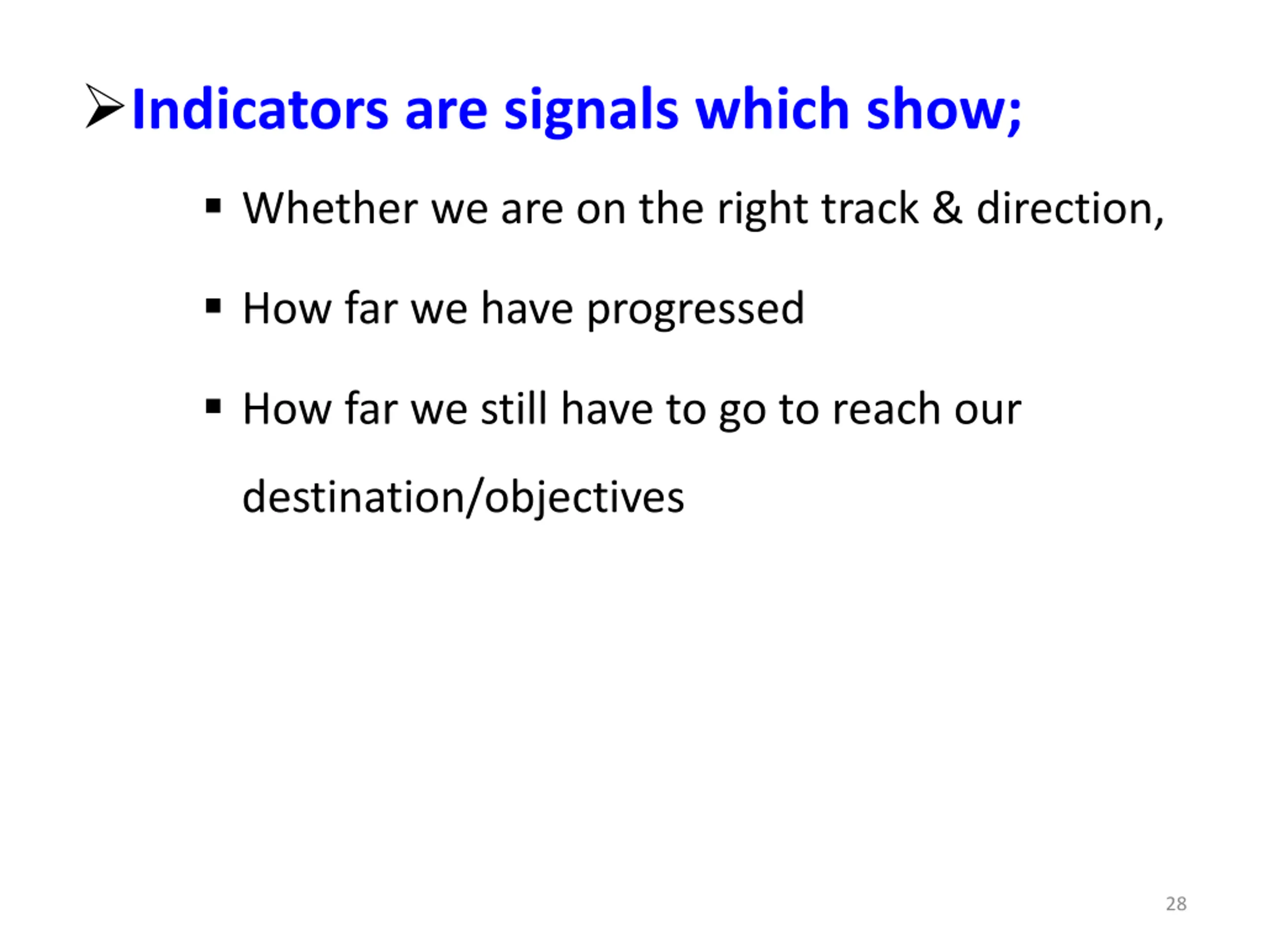 Indicators are signals which show; Whether we are on the right track & direction, How far we have progressed How far we still have to go to reach our destination/objectives 28