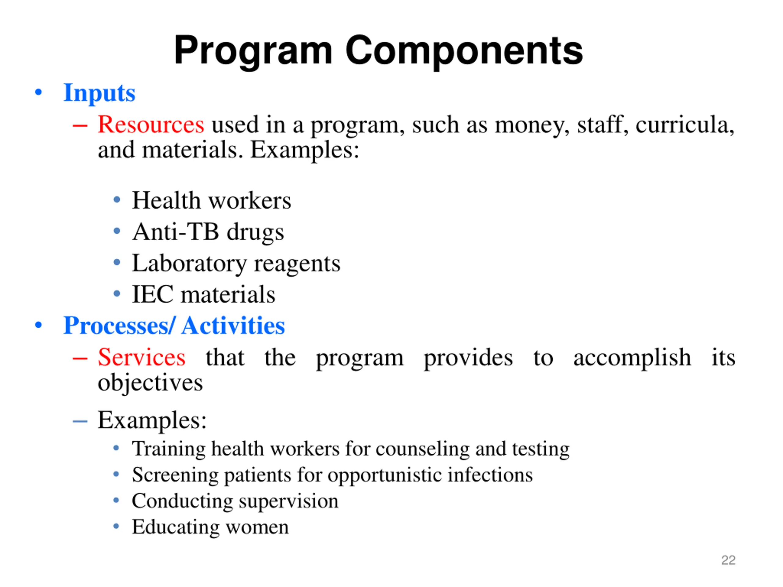 Program Components Inputs Resources used in a program, such as money, staff, curricula, and materials. Examples: Health workers Anti-TB drugs Laboratory reagents IEC materials Processes/ Activities Services that the program provides to accomplish its objectives Examples: Training health workers for counseling and testing Screening patients for opportunistic infections Conducting supervision Educating women 22