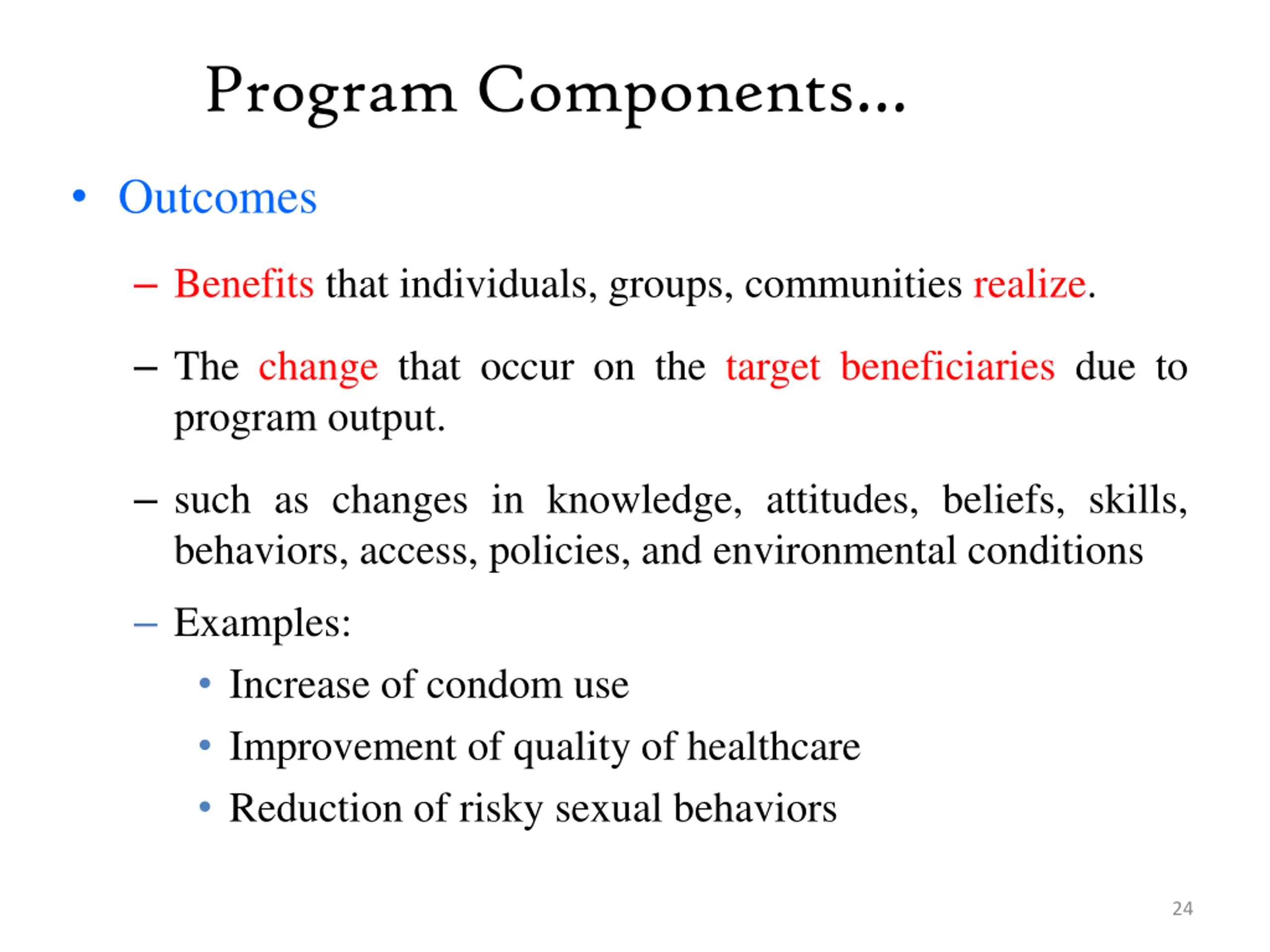 Program Components Outcomes Benefits that individuals, groups, communities realize. The change that occur on the target beneficiaries due to program output. such as changes in knowledge, attitudes, beliefs, skills, behaviors, access, policies, and environmental conditions Examples: Increase of condom use Improvement of quality of healthcare Reduction of risky sexual behaviors 24
