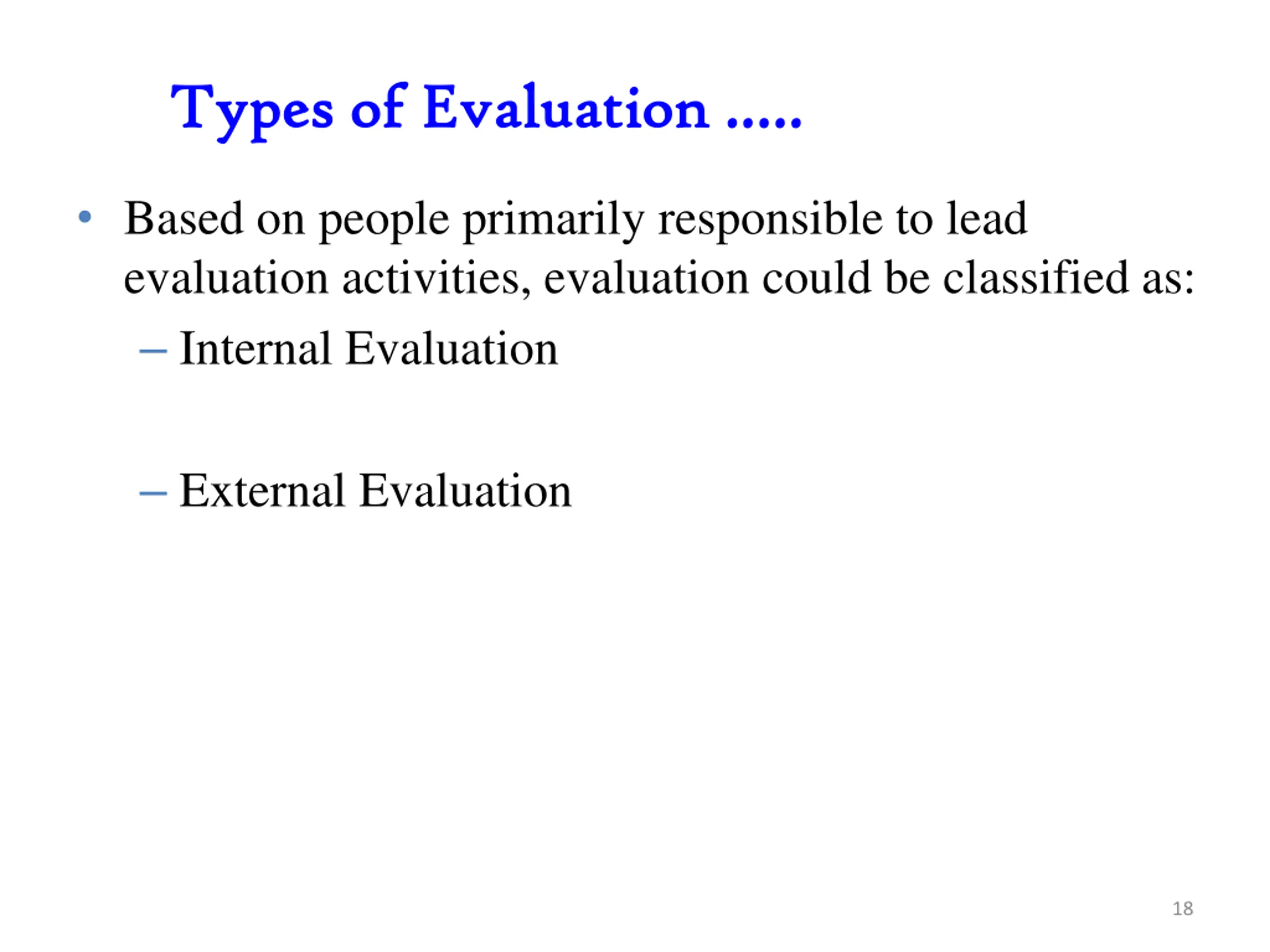 Types of Evaluation .. Types of Evaluation . . Based on people primarily responsible to lead evaluation activities, evaluation could be classified as: Internal Evaluation External Evaluation 18