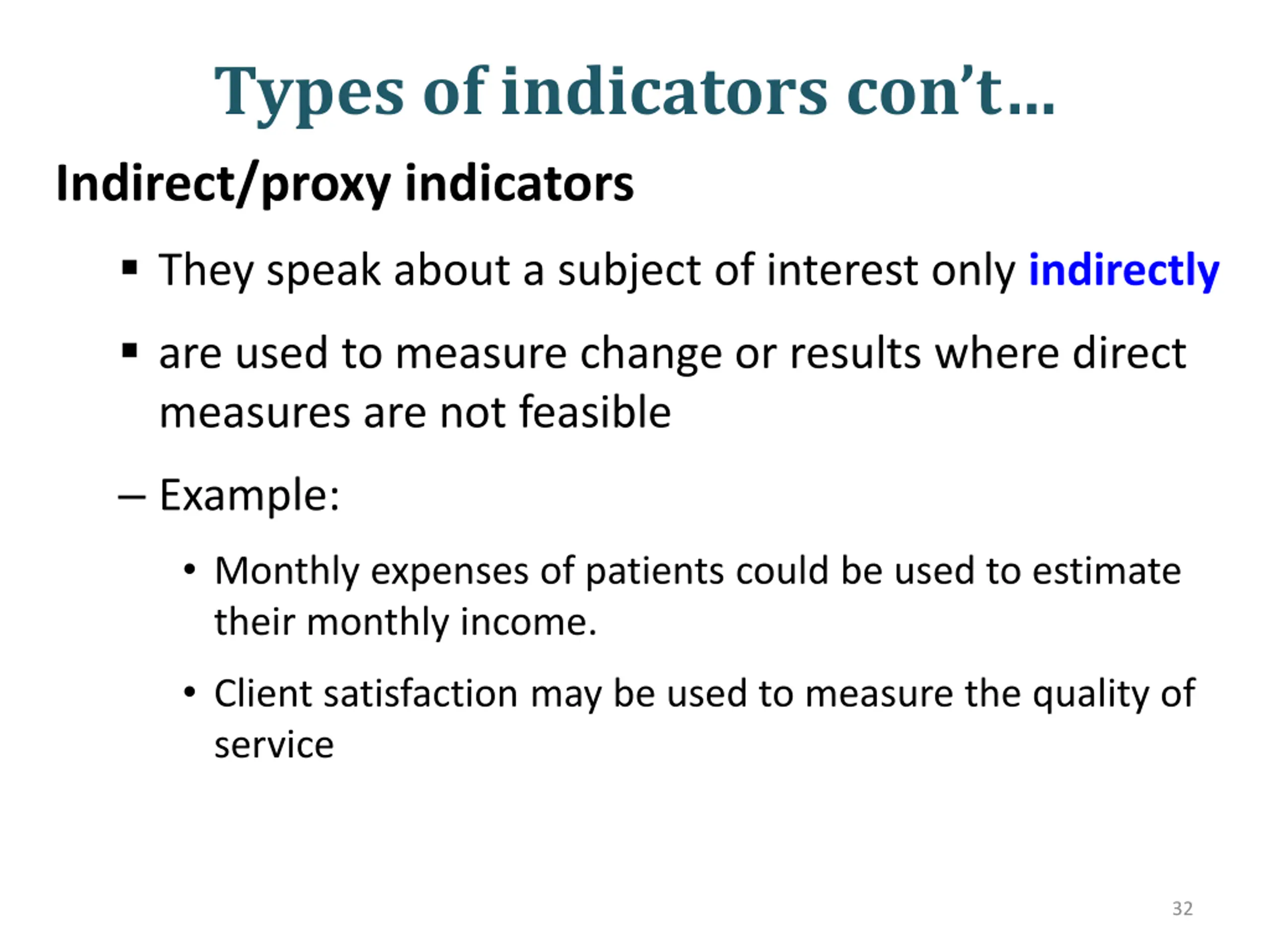 Types of indicators cont Indirect/proxy indicators They speak about a subject of interest only indirectly are used to measure change or results where direct measures are not feasible Example: Monthly expenses of patients could be used to estimate their monthly income. Client satisfaction may be used to measure the quality of service 32