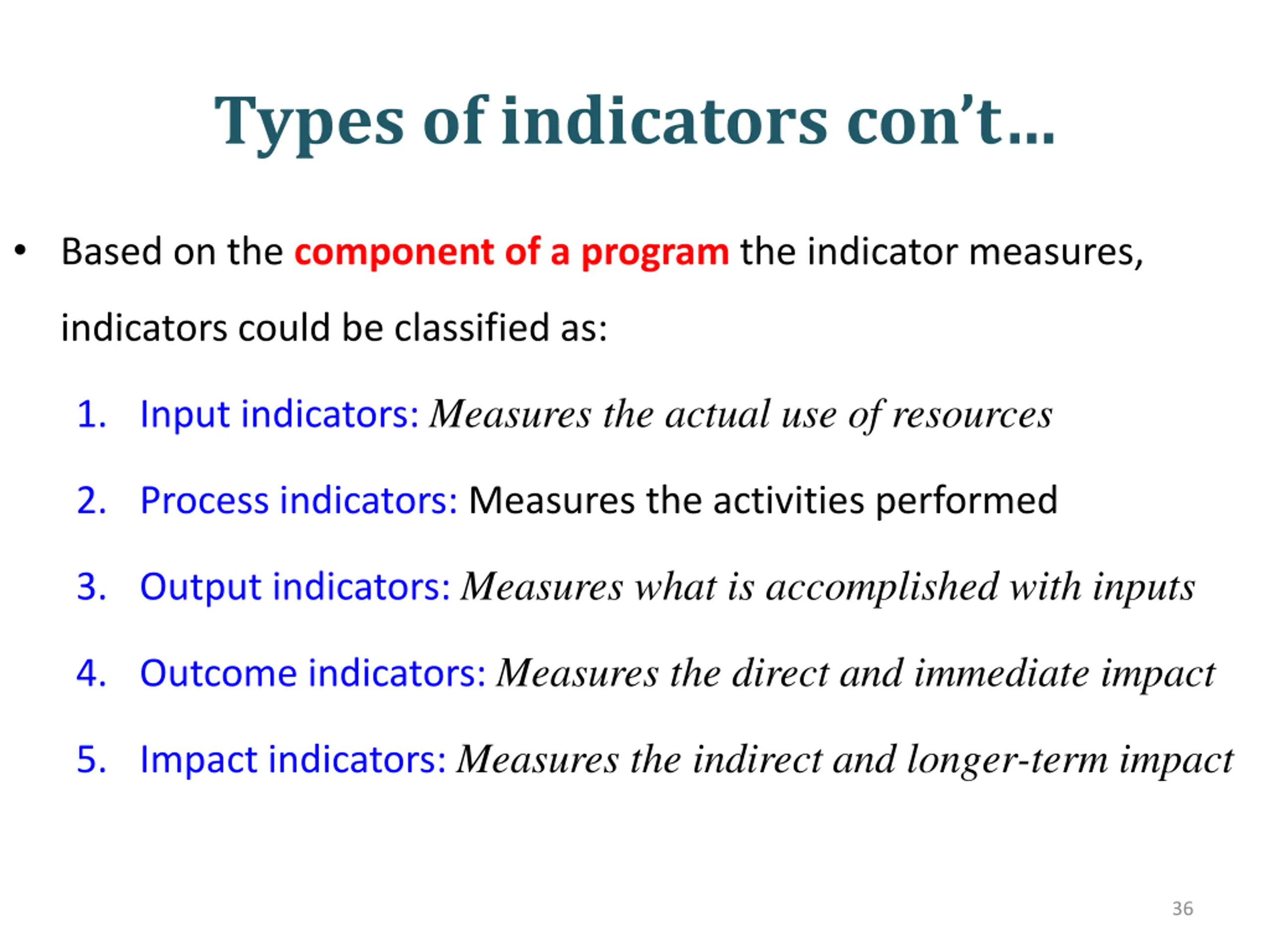 Types of indicators cont Based on the component of a program the indicator measures, indicators could be classified as: 1. Input indicators: Measures the actual use of resources 2. Process indicators: Measures the activities performed 3. Output indicators: Measures what is accomplished with inputs 4. Outcome indicators: Measures the direct and immediate impact 5. Impact indicators: Measures the indirect and longer-term impact 36