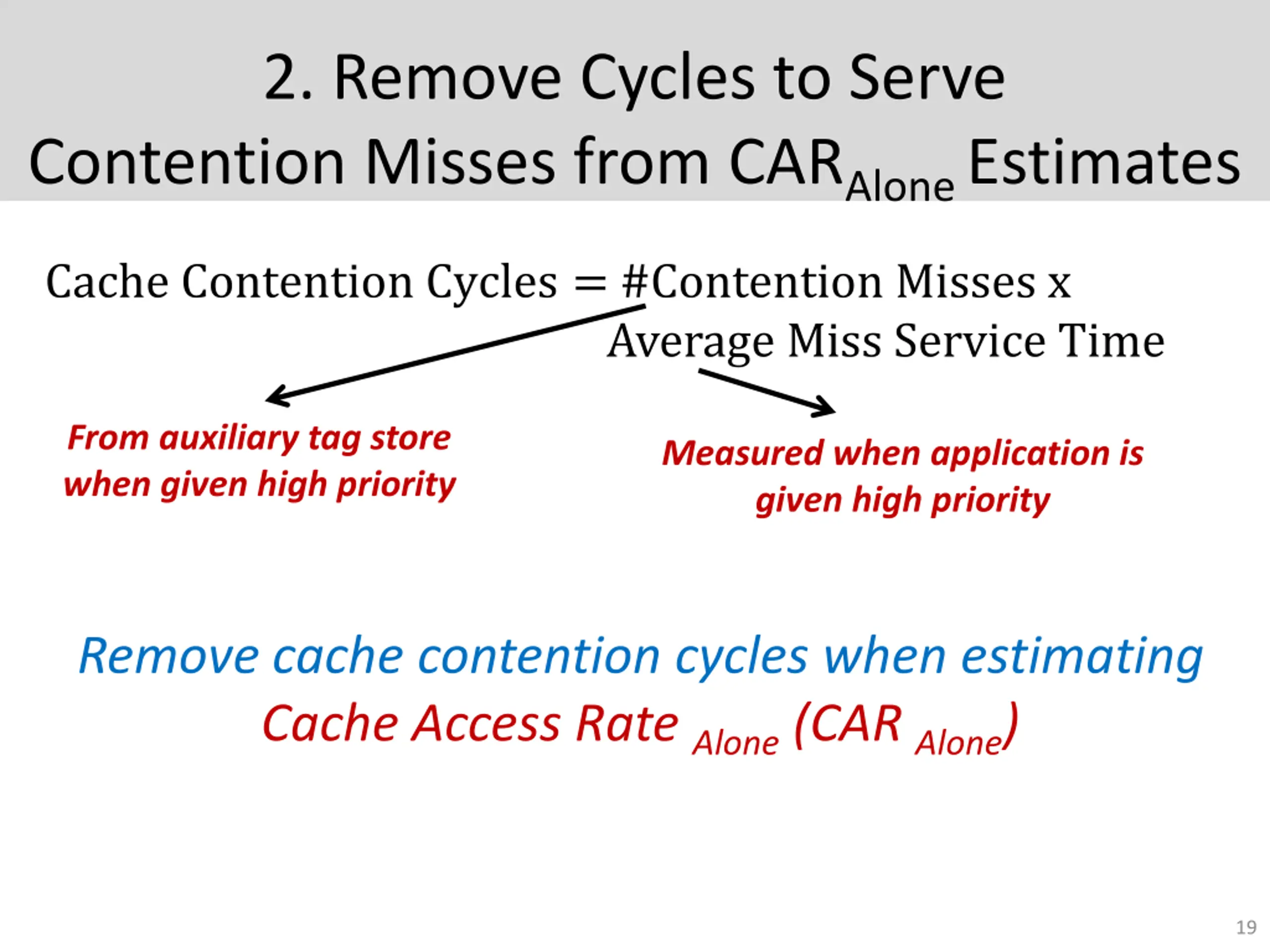 2. Remove Cycles to Serve Contention Misses from CARAlone Estimates Cache Contention Cycles = #Contention Misses x Average Miss Service Time From auxiliary tag store when given high priority Measured when application is given high priority Remove cache contention cycles when estimating Cache Access Rate Alone (CAR Alone) 19