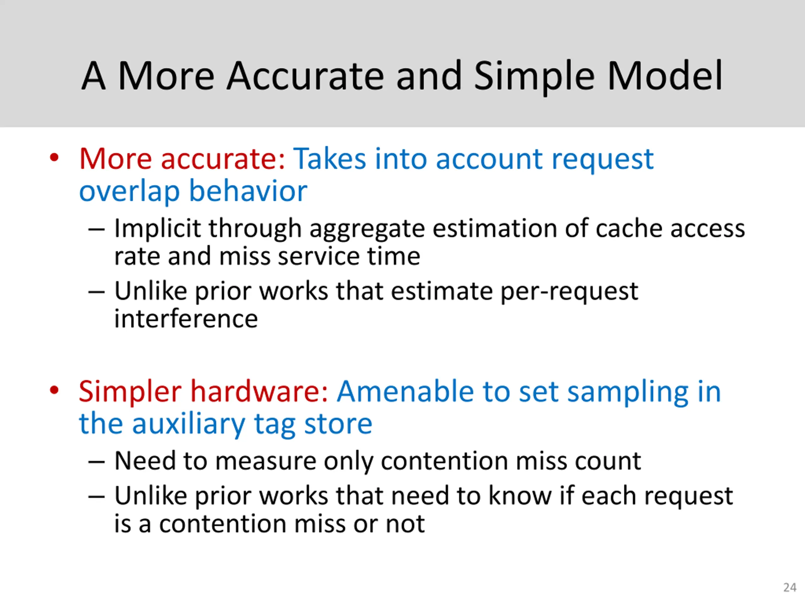 A More Accurate and Simple Model More accurate: Takes into account request overlap behavior Implicit through aggregate estimation of cache access rate and miss service time Unlike prior works that estimate per-request interference Simpler hardware: Amenable to set sampling in the auxiliary tag store Need to measure only contention miss count Unlike prior works that need to know if each request is a contention miss or not 24