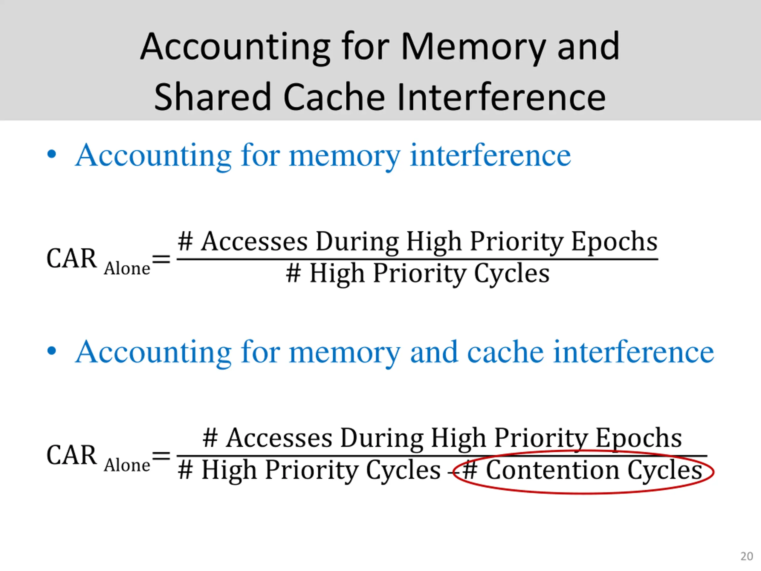 Accounting for Memory and Shared Cache Interference Accounting for memory interference CAR Alone=# Accesses During High Priority Epochs # High Priority Cycles Accounting for memory and cache interference # Accesses During High Priority Epochs # High Priority Cycles # Contention Cycles CAR Alone= 20