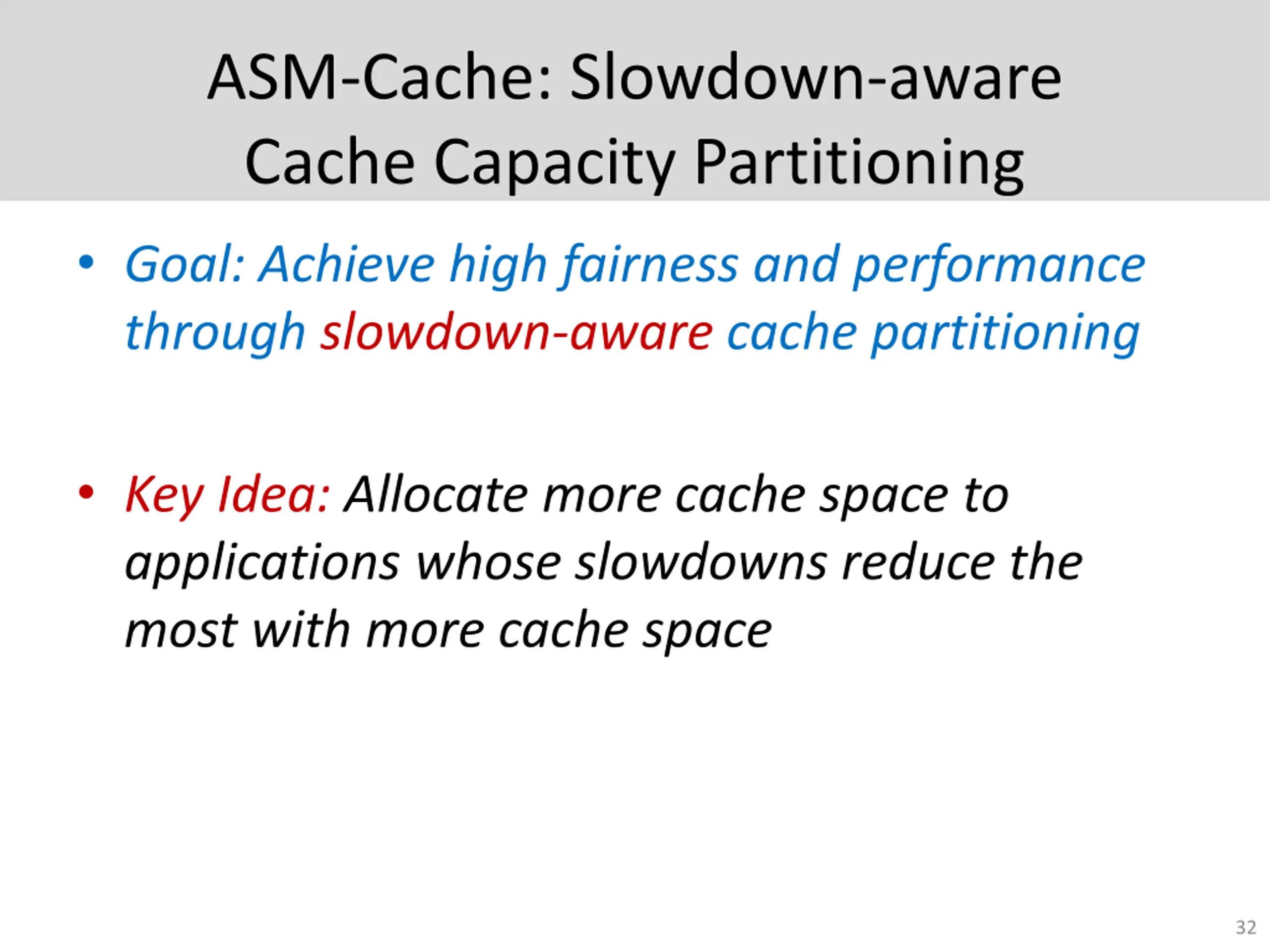 Cache Capacity Partitioning Core Shared Cache Main Memory Core Previous partitioning schemes mainly focus on miss count reduction Problem: Does not directly translate to performance and slowdowns 31