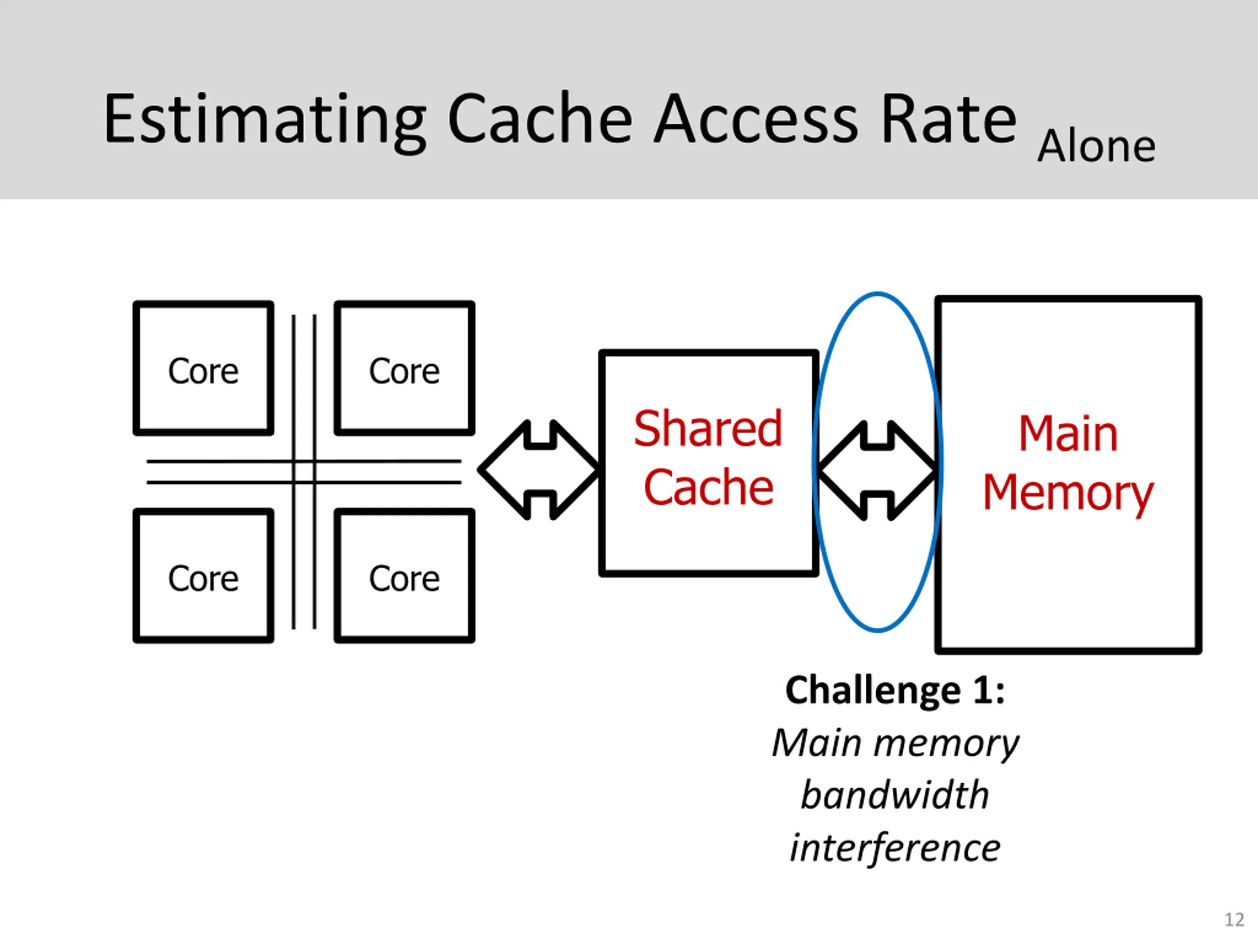Estimating Cache Access Rate Alone Core Core Shared Cache Main Memory Core Core Challenge 2: Shared cache capacity interference Challenge 1: Main memory bandwidth interference 11