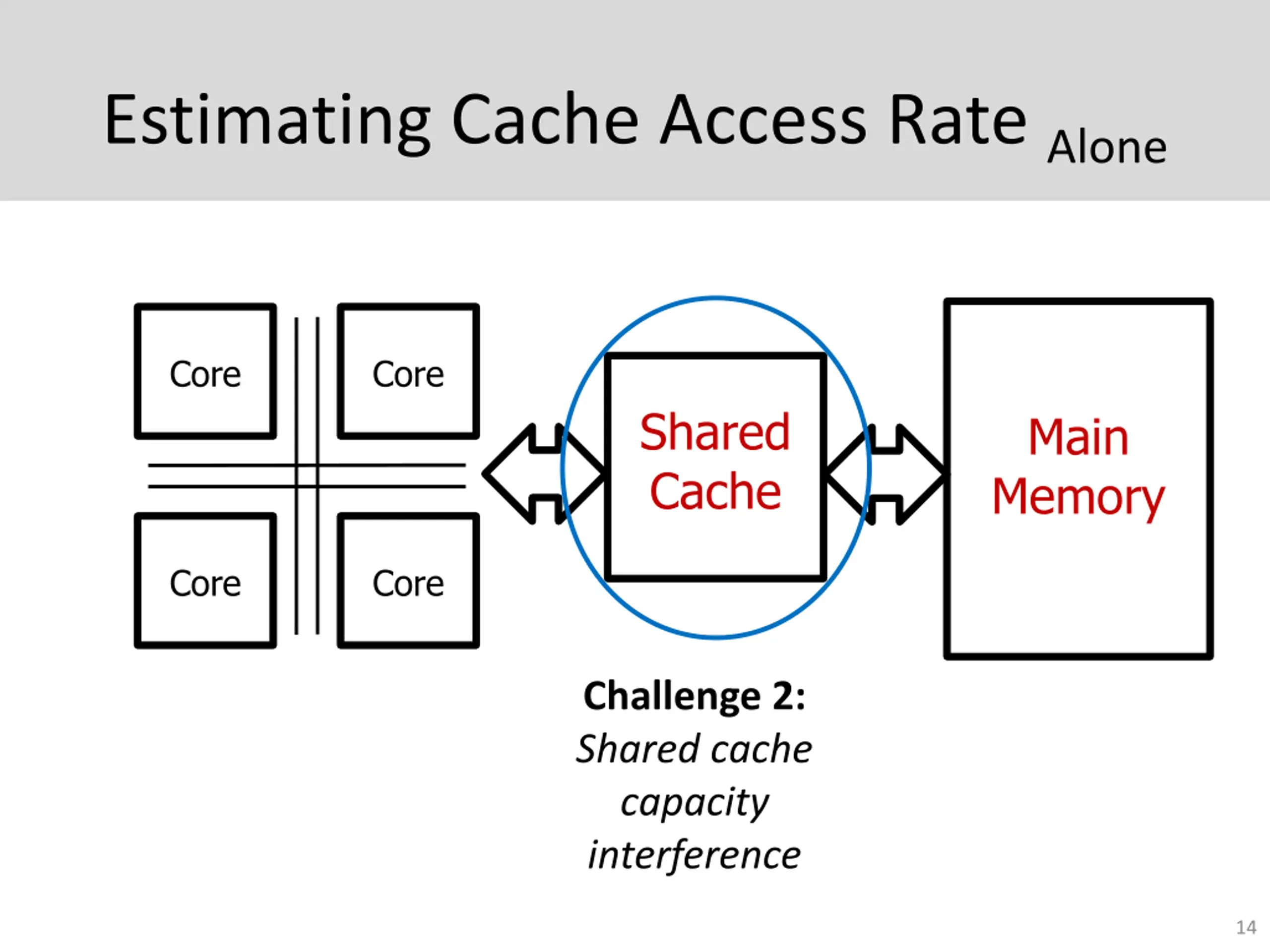 Estimating Cache Access Rate Alone Core Core Shared Cache Main Memory Core Core Challenge 1: Main memory bandwidth interference 12