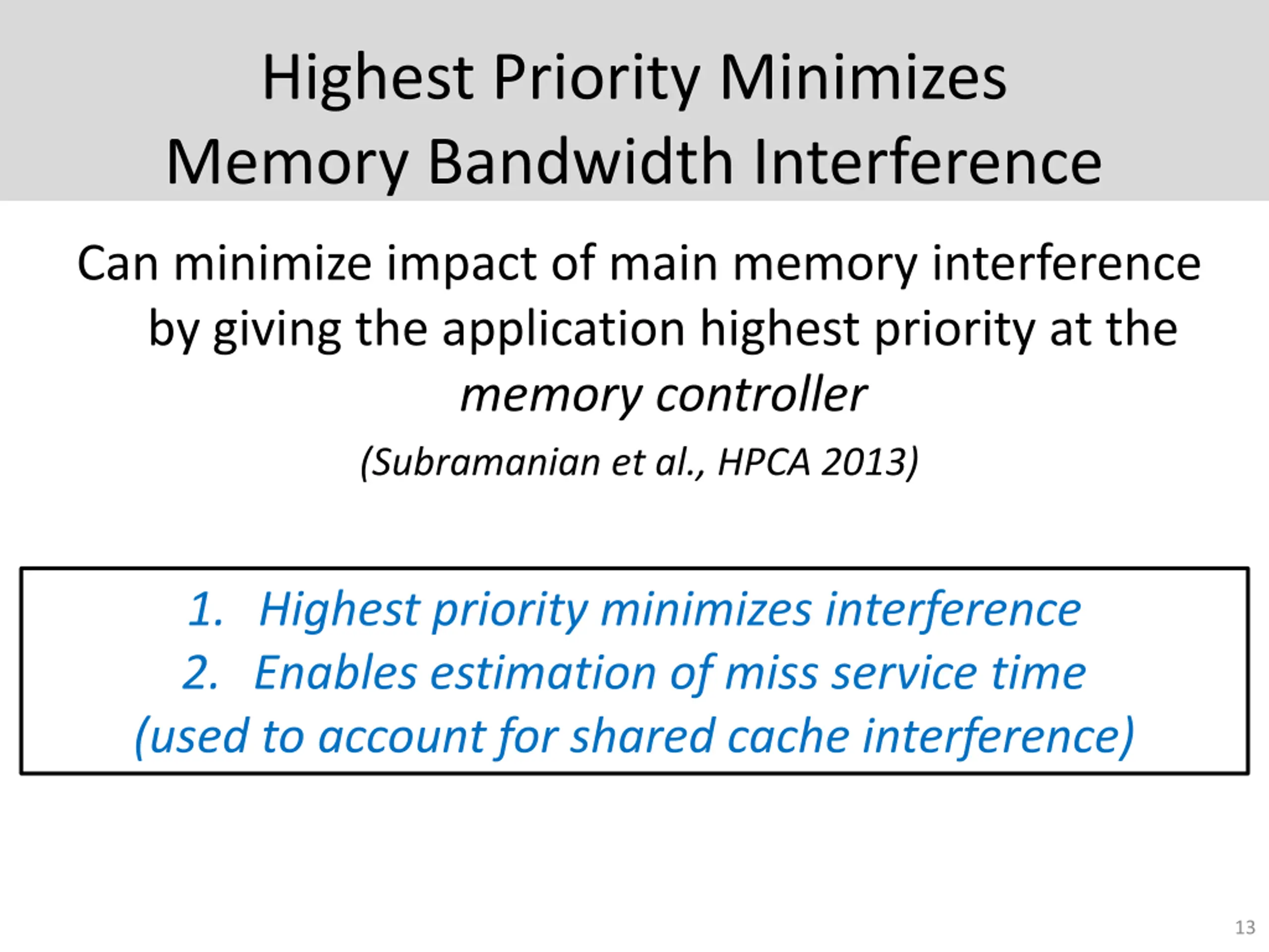 Highest Priority Minimizes Memory Bandwidth Interference Can minimize impact of main memory interference by giving the application highest priority at the memory controller (Subramanian et al., HPCA 2013) Highest priority Little interference (almost as if the application were run alone) 2. Enables estimation of miss service time (used to account for shared cache interference) 1. Highest priority minimizes interference 13