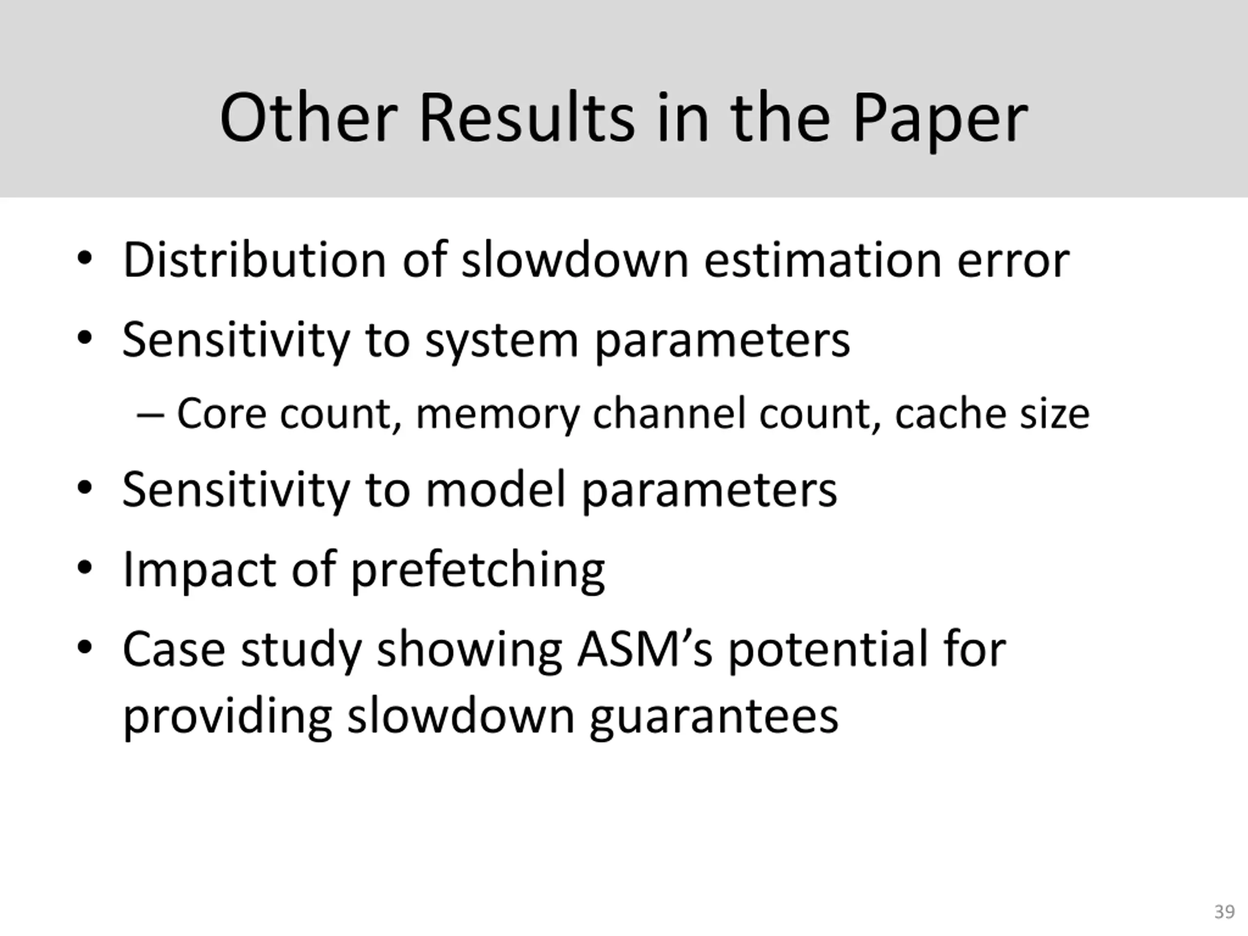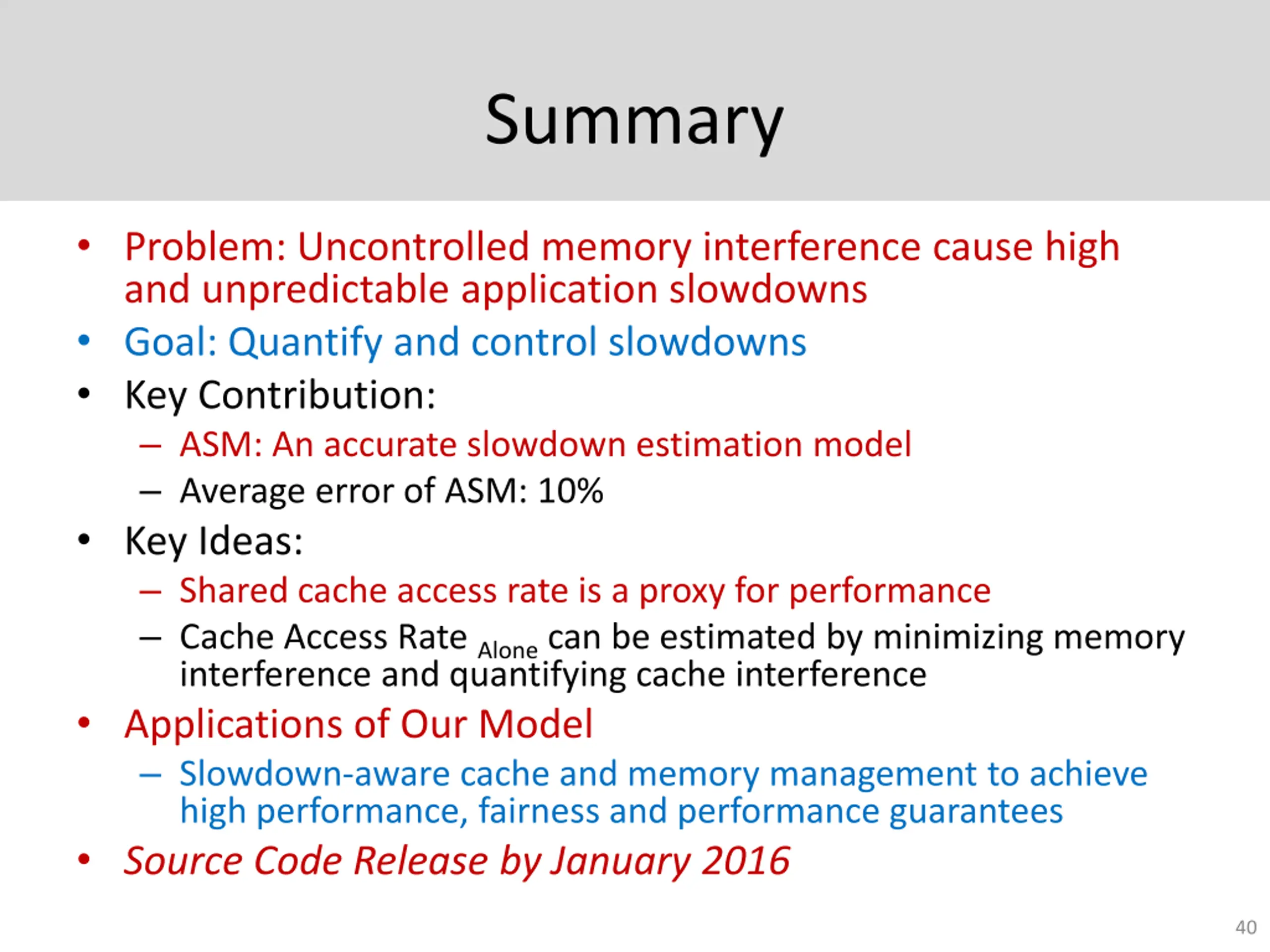 Other Results in the Paper Distribution of slowdown estimation error Sensitivity to system parameters Core count, memory channel count, cache size Sensitivity to model parameters Impact of prefetching Case study showing ASM s potential for providing slowdown guarantees 39