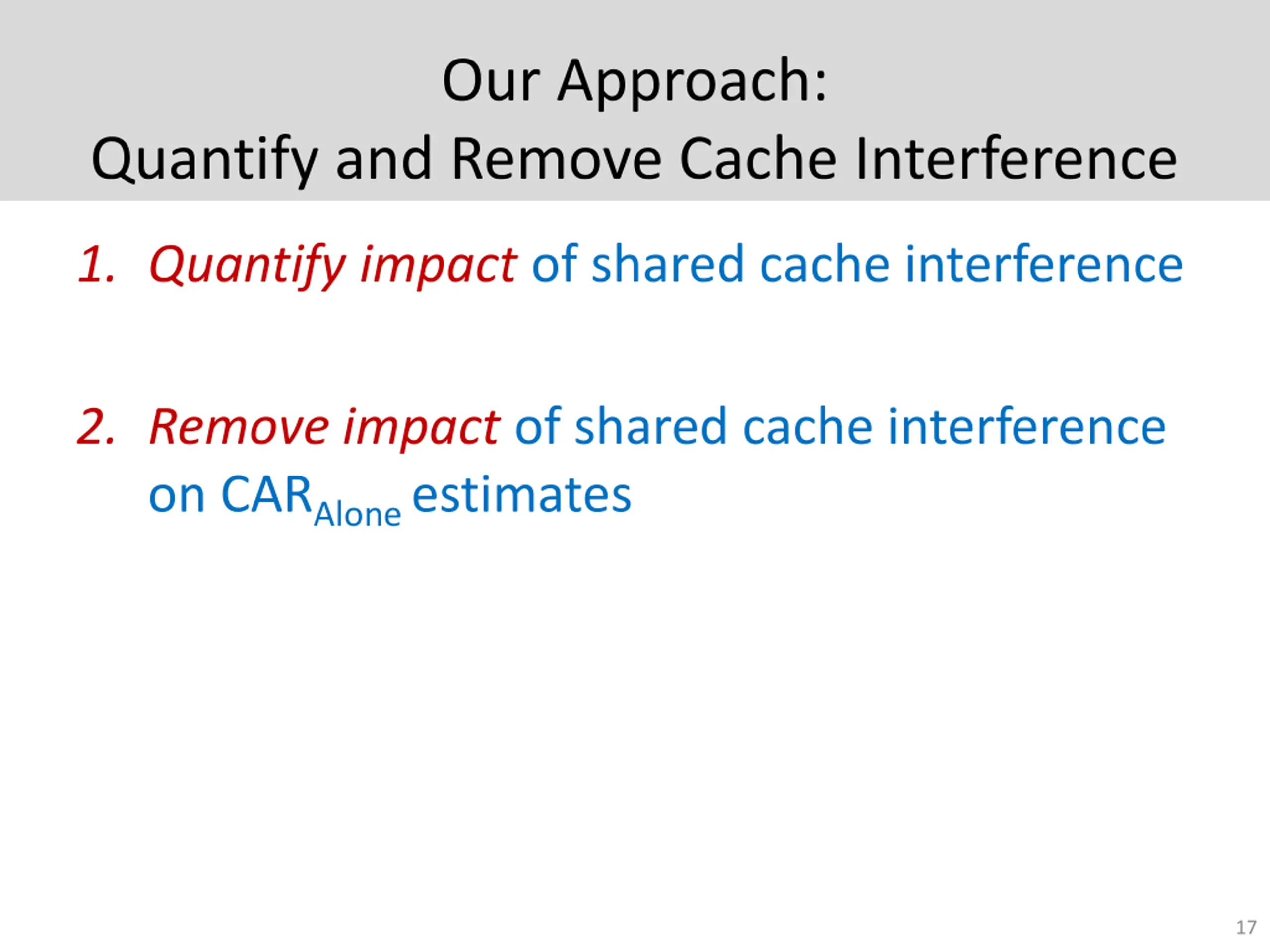 Our Approach: Quantify and Remove Cache Interference 1. Quantify impact of shared cache interference 2. Remove impact of shared cache interference on CARAlone estimates 17