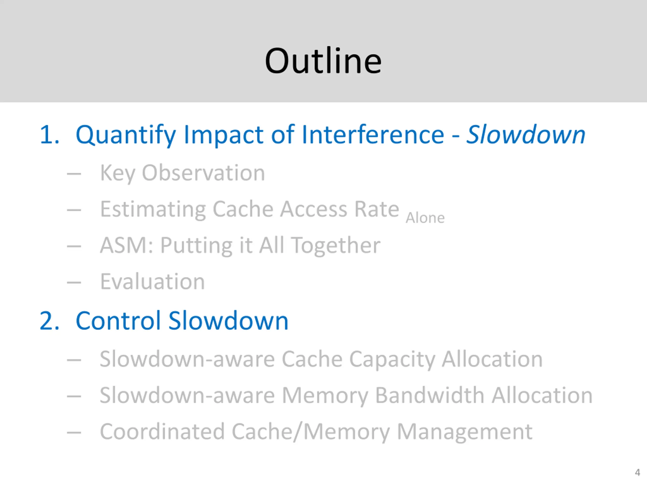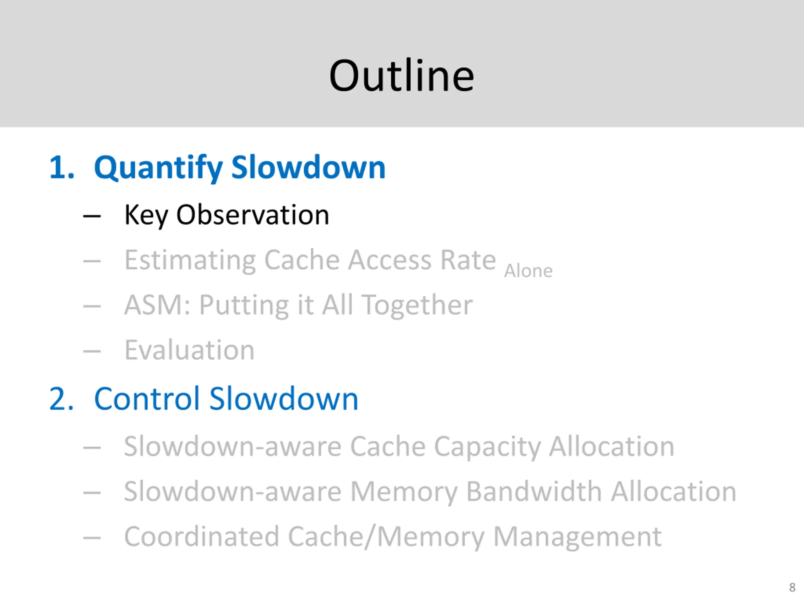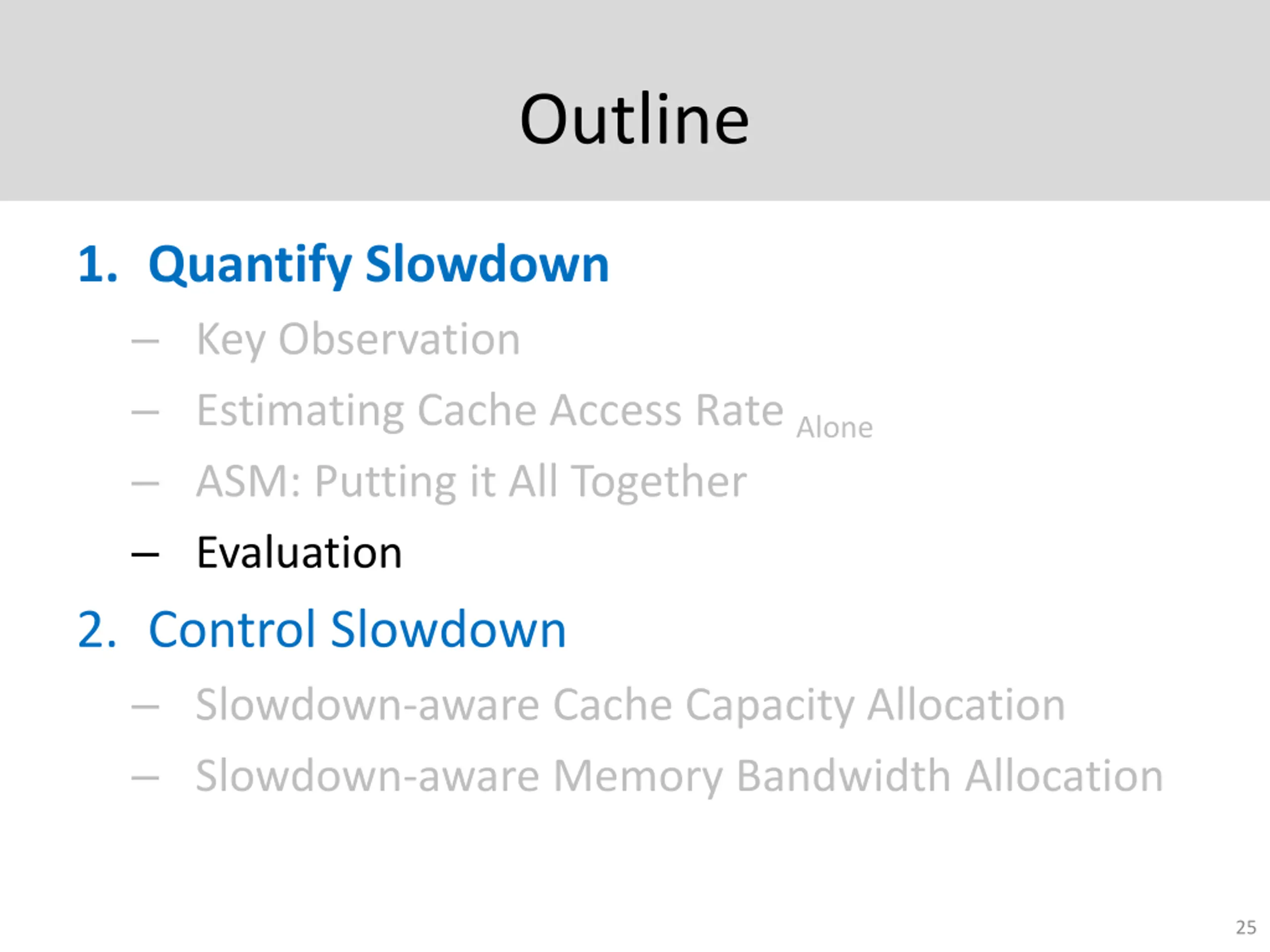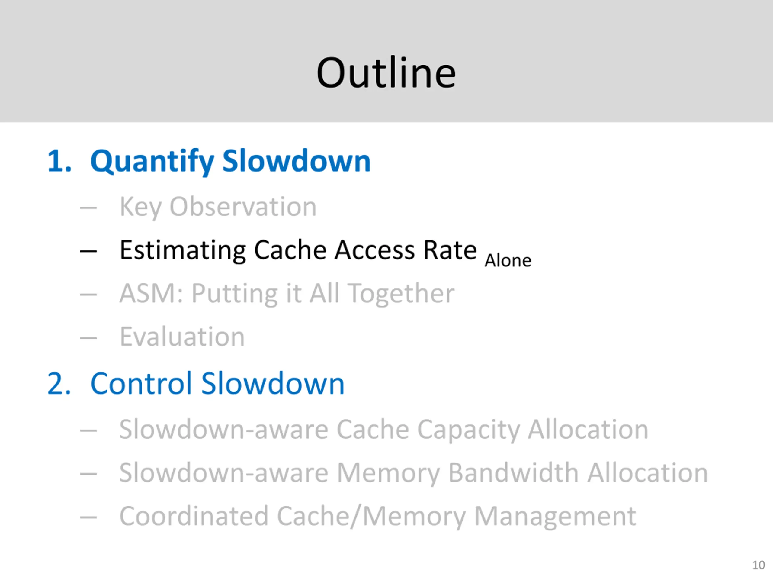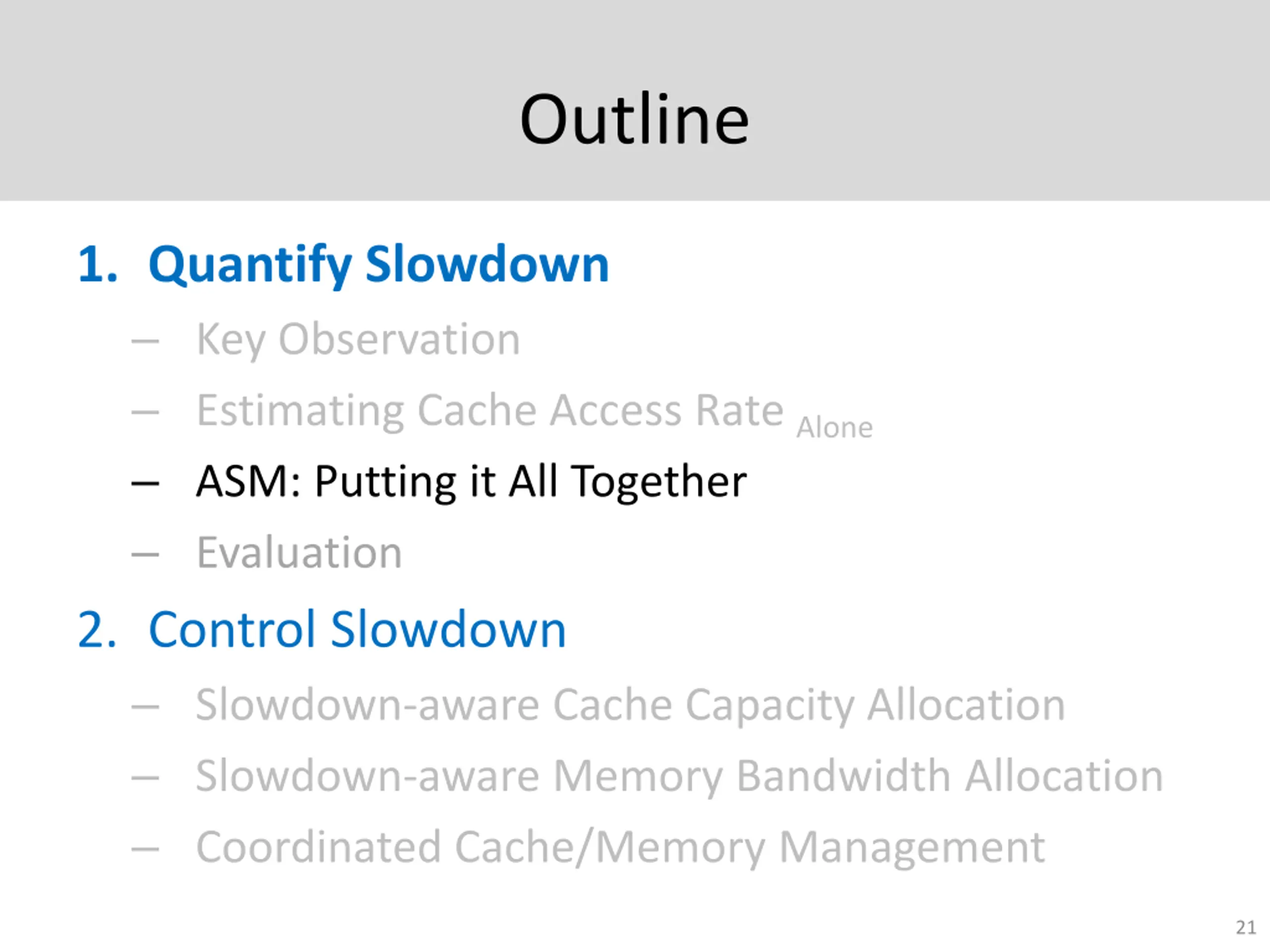 Outline 1. Quantify Impact of Interference - Slowdown Key Observation Estimating Cache Access Rate Alone ASM: Putting it All Together Evaluation 2. Control Slowdown Slowdown-aware Cache Capacity Allocation Slowdown-aware Memory Bandwidth Allocation Coordinated Cache/Memory Management 4