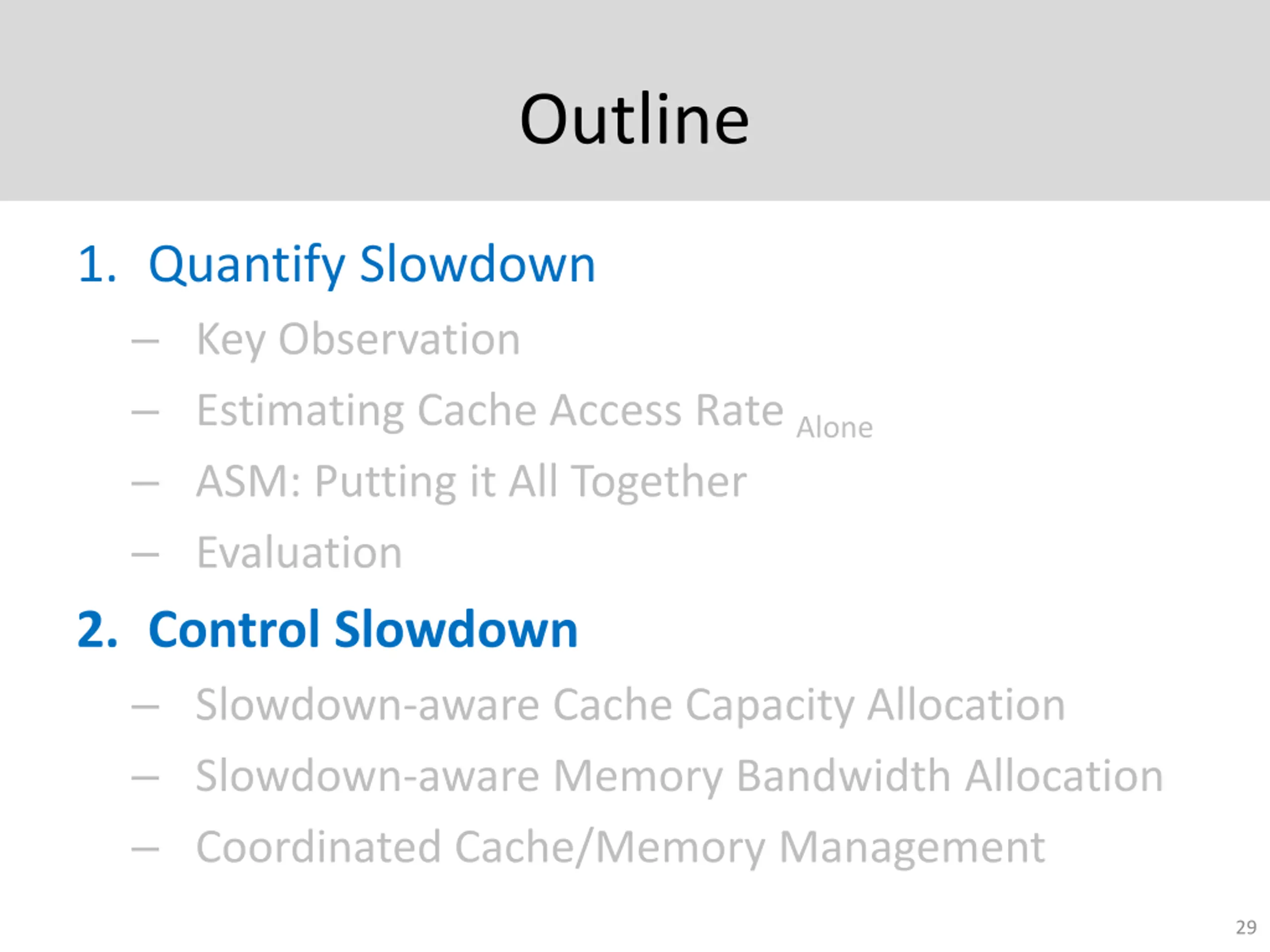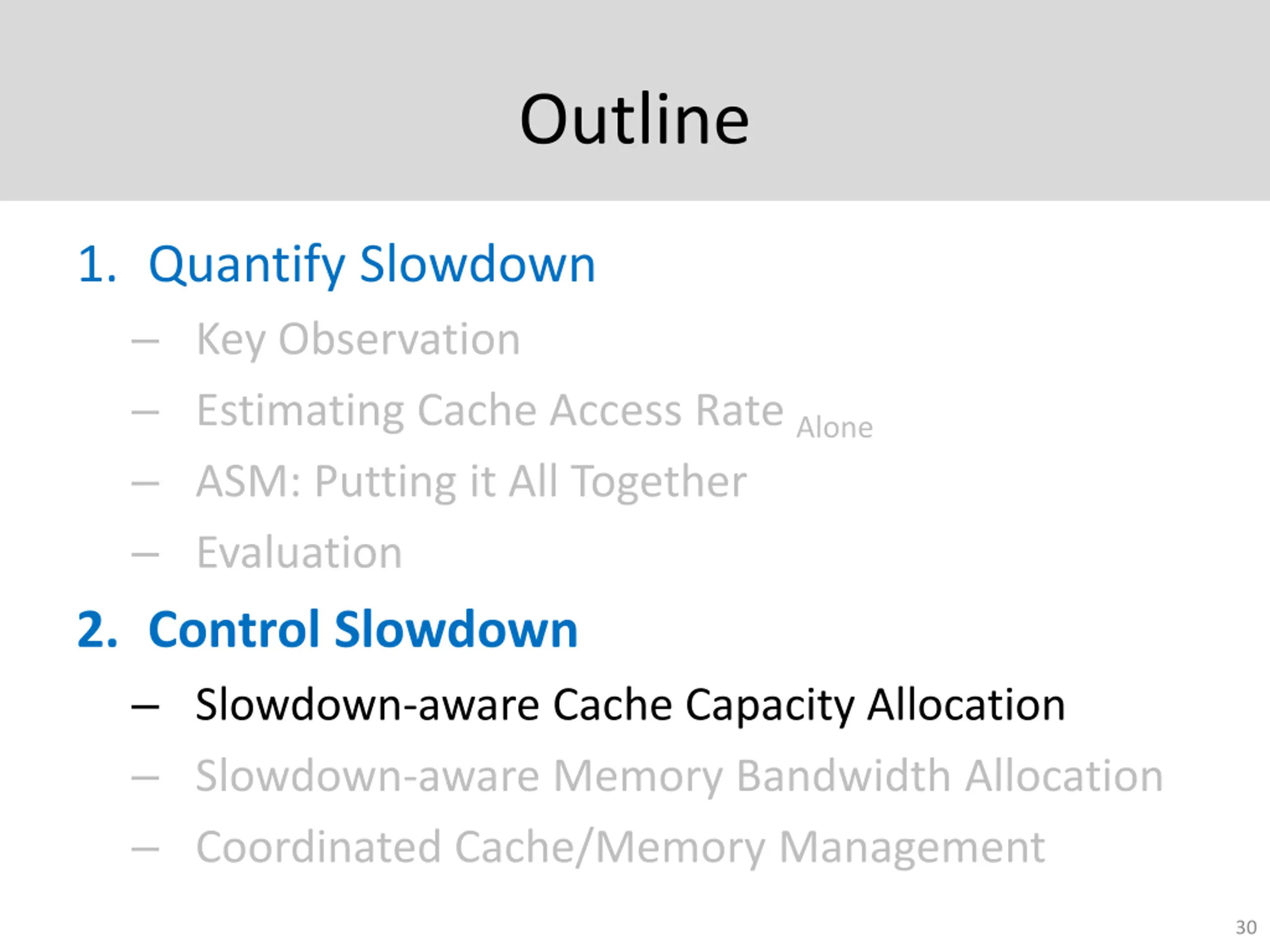 Outline 1. Quantify Slowdown Key Observation Estimating Cache Access Rate Alone ASM: Putting it All Together Evaluation 2. Control Slowdown Slowdown-aware Cache Capacity Allocation Slowdown-aware Memory Bandwidth Allocation Coordinated Cache/Memory Management 29