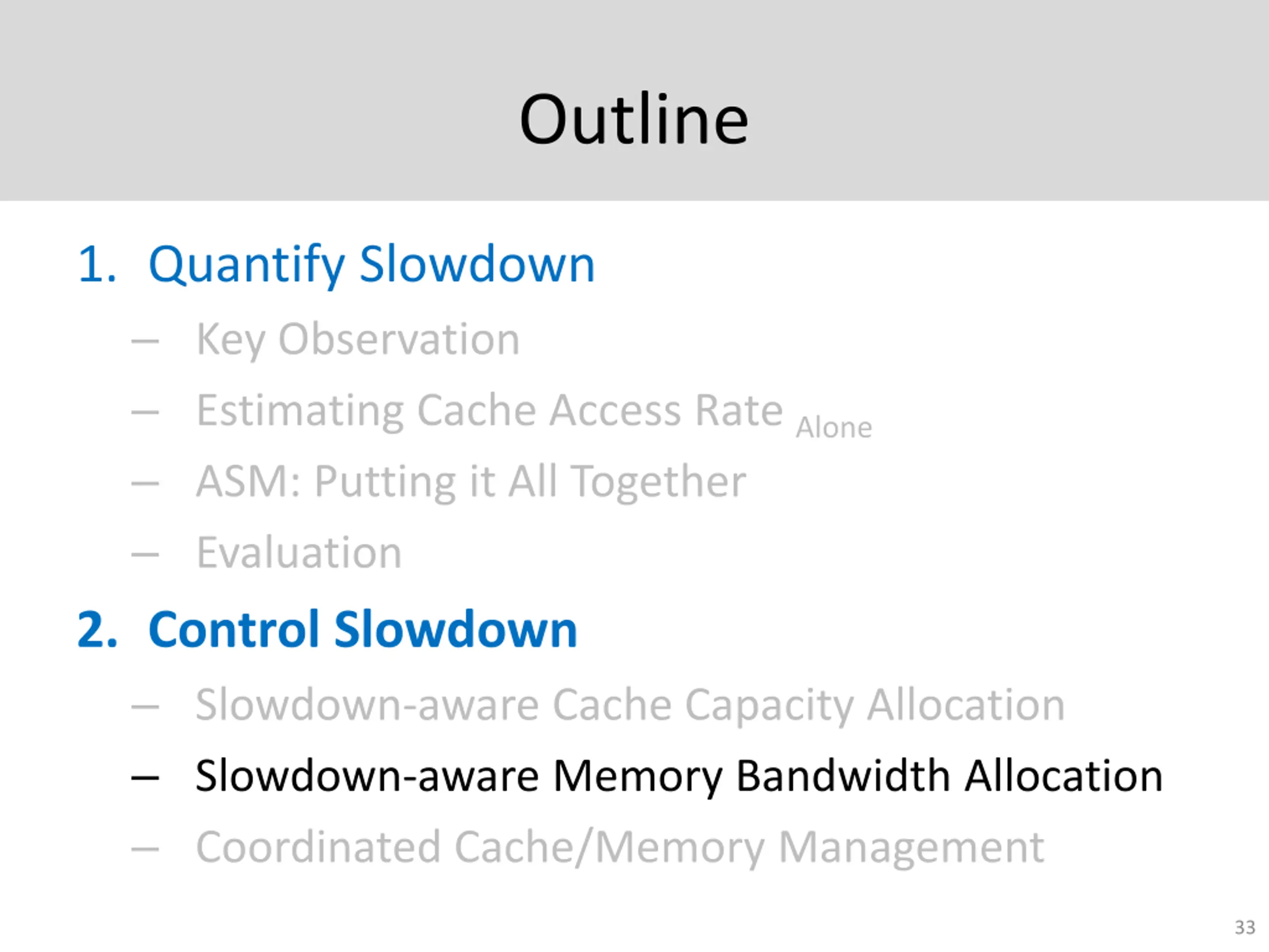 ASM-Cache: Slowdown-aware Cache Capacity Partitioning Goal: Achieve high fairness and performance through slowdown-aware cache partitioning Key Idea: Allocate more cache space to applications whose slowdowns reduce the most with more cache space 32