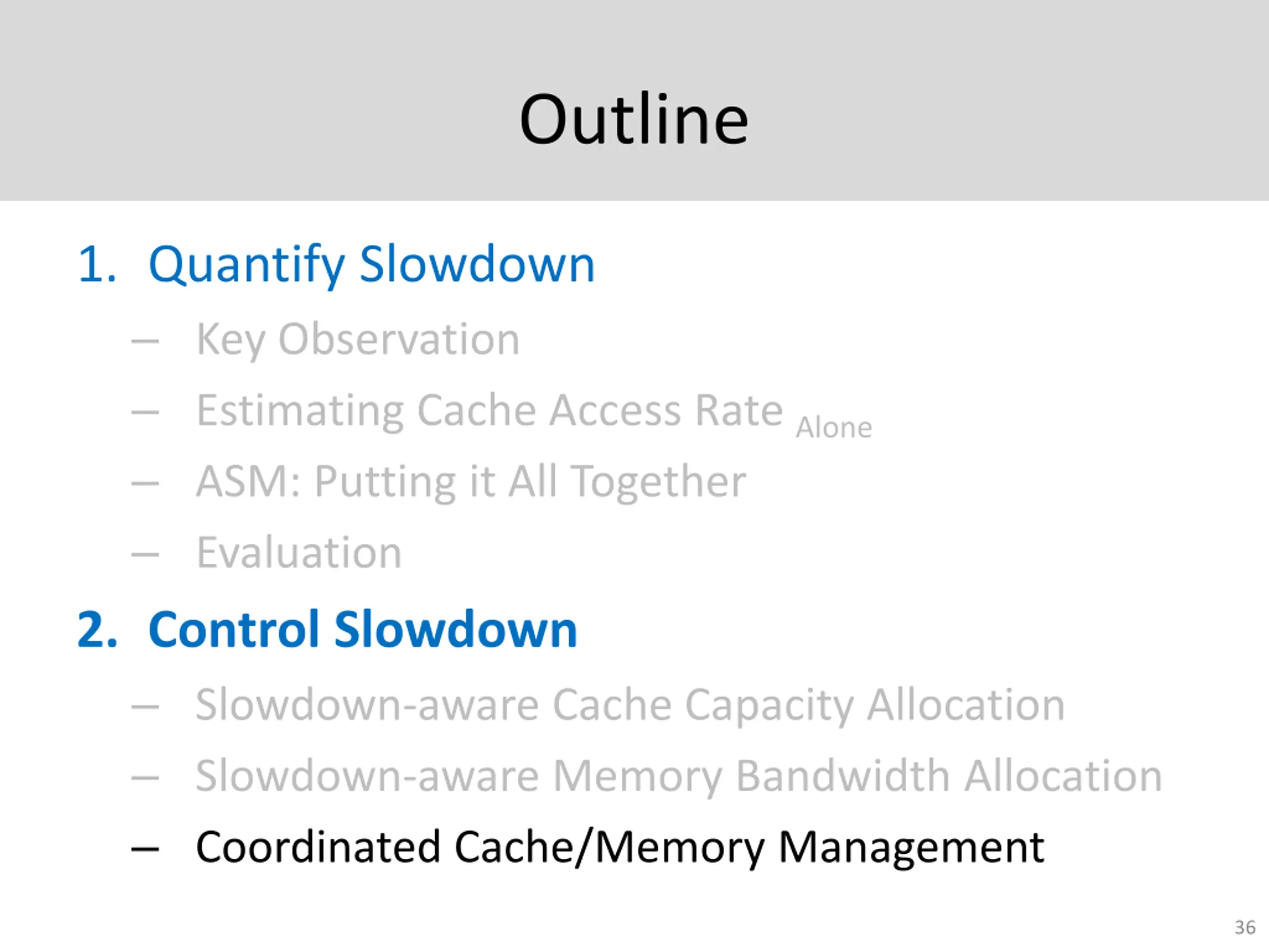Outline 1. Quantify Slowdown Key Observation Estimating Cache Access Rate Alone ASM: Putting it All Together Evaluation 2. Control Slowdown Slowdown-aware Cache Capacity Allocation Slowdown-aware Memory Bandwidth Allocation Coordinated Cache/Memory Management 36