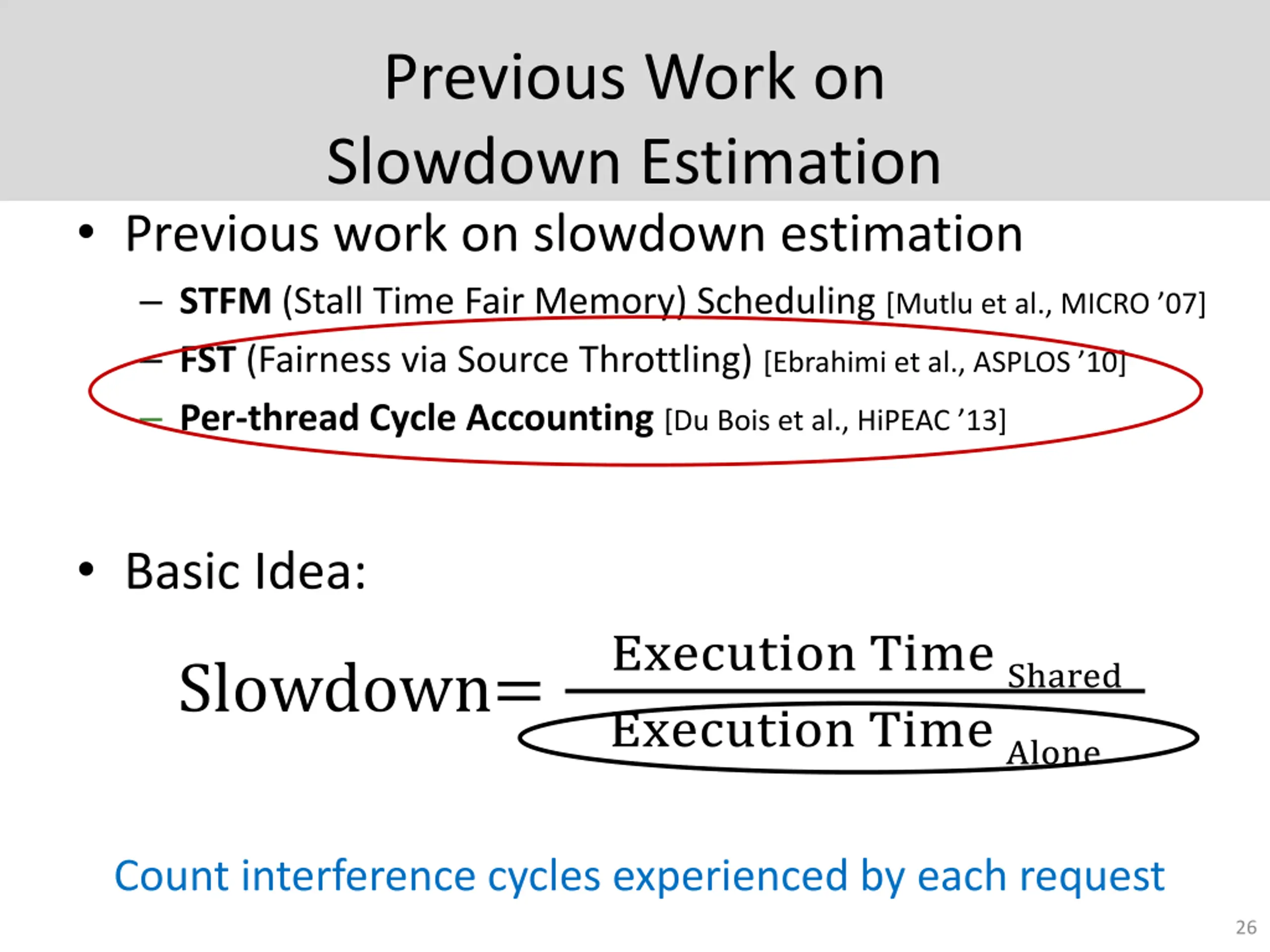 Previous Work on Slowdown Estimation Previous work on slowdown estimation STFM (Stall Time Fair Memory) Scheduling [Mutlu et al., MICRO 07] FST (Fairness via Source Throttling) [Ebrahimi et al., ASPLOS 10] Per-thread Cycle Accounting [Du Bois et al., HiPEAC 13] Basic Idea: Slowdown= Execution Time Shared Execution Time Alone Count interference cycles experienced by each request 26
