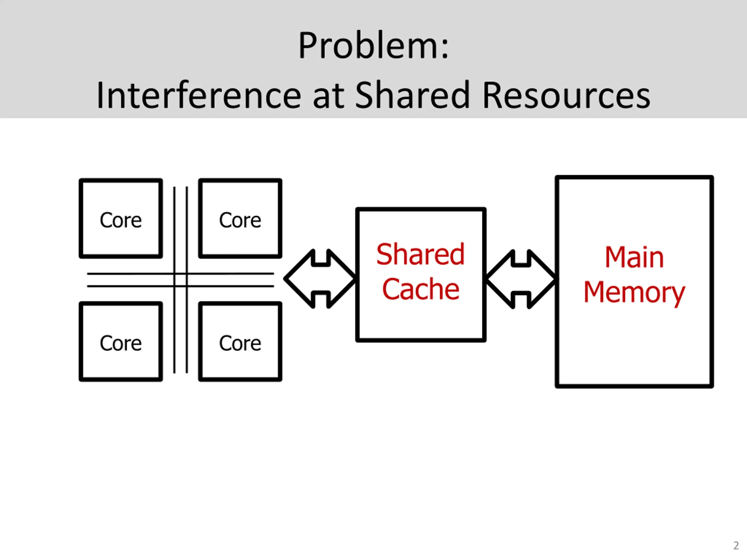Problem: Interference at Shared Resources Core Core Shared Cache Main Memory Core Core 2