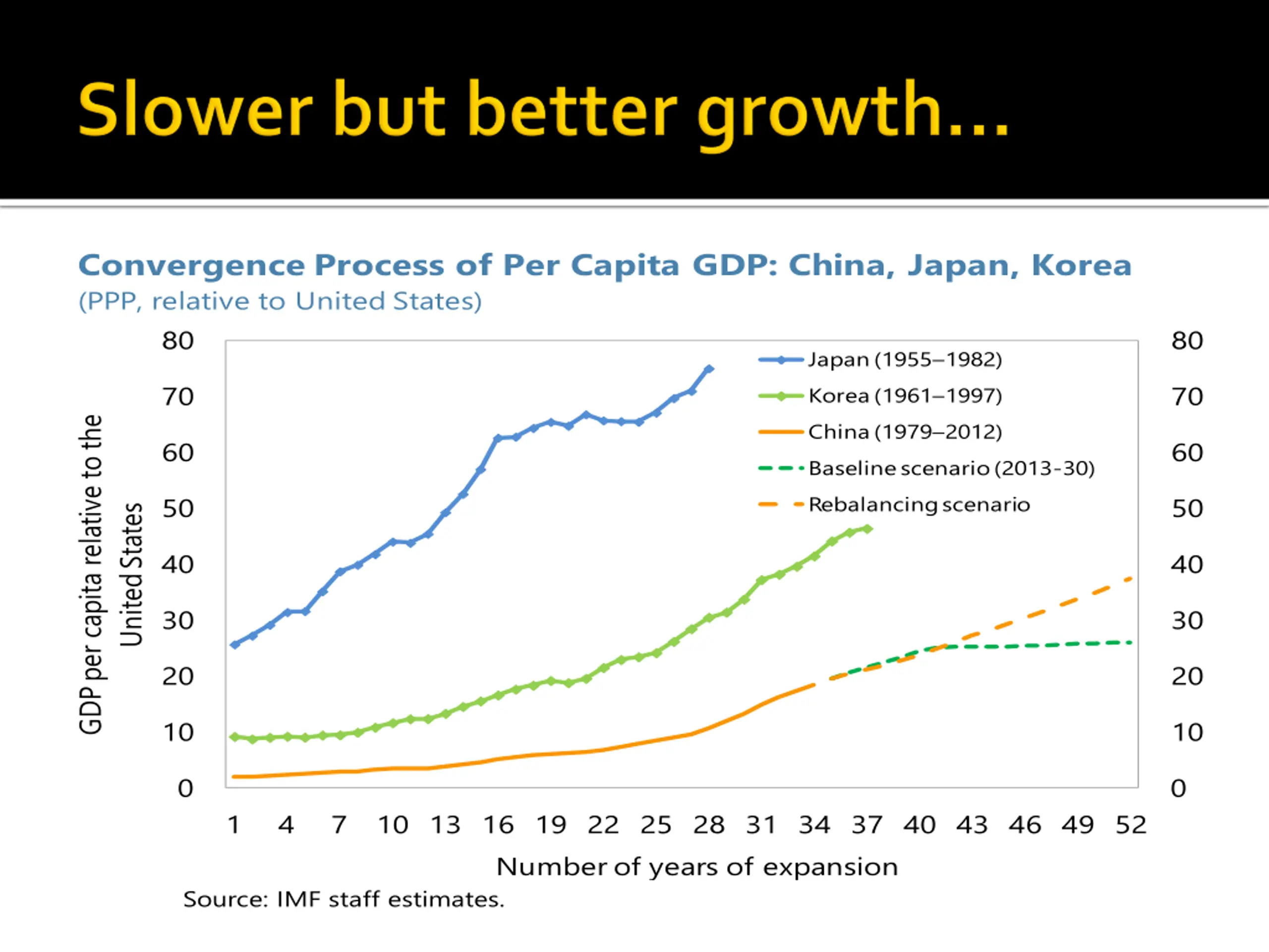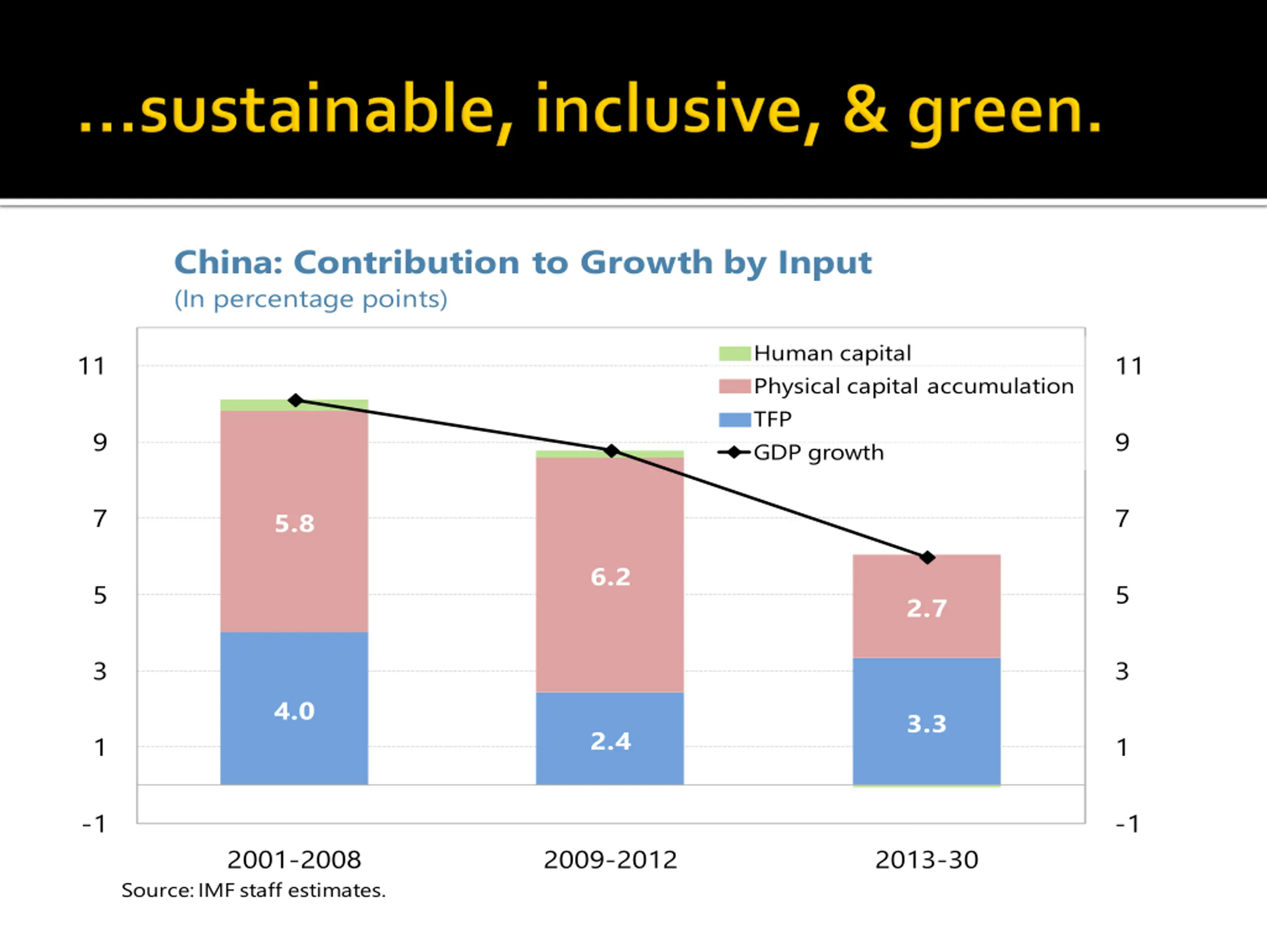 China: Contribution to Growth by Input (In percentage points) Human capital Physical capital accumulation TFP GDP growth 11 11 9 9 7 7 5.8 6.2 5 5 2.7 3 3 4.0 3.3 2.4 1 1 -1 -1 2001-2008 2009-2012 2013-30 Source:IMF staff estimates.
