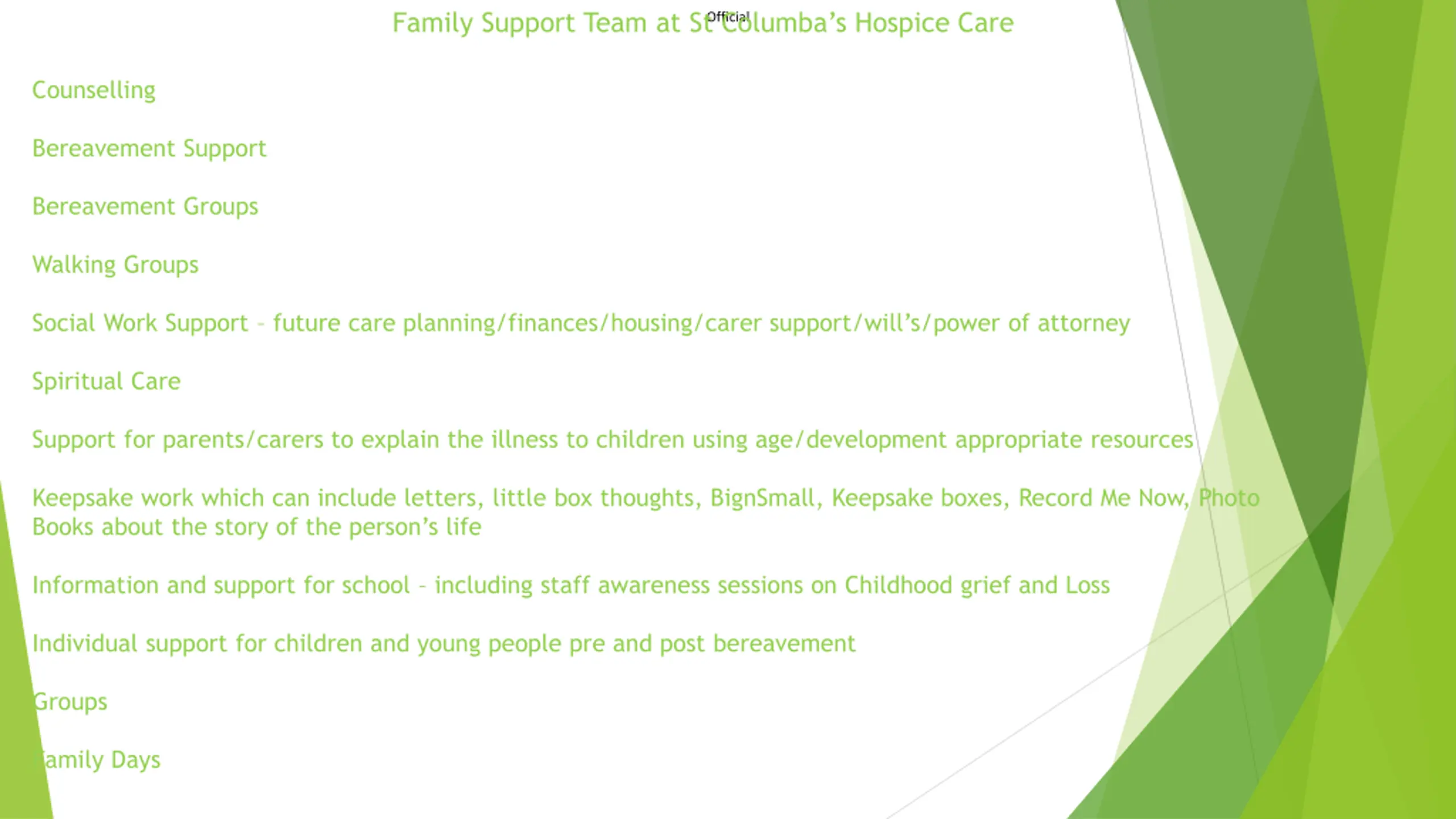 Family Support Team at St Columbas Hospice Care Official Counselling Bereavement Support Bereavement Groups Walking Groups Social Work Support future care planning/finances/housing/carer support/will s/power of attorney Spiritual Care Support for parents/carers to explain the illness to children using age/development appropriate resources Keepsake work which can include letters, little box thoughts, BignSmall, Keepsake boxes, Record Me Now, Photo Books about the story of the person s life Information and support for school including staff awareness sessions on Childhood grief and Loss Individual support for children and young people pre and post bereavement Groups Family Days