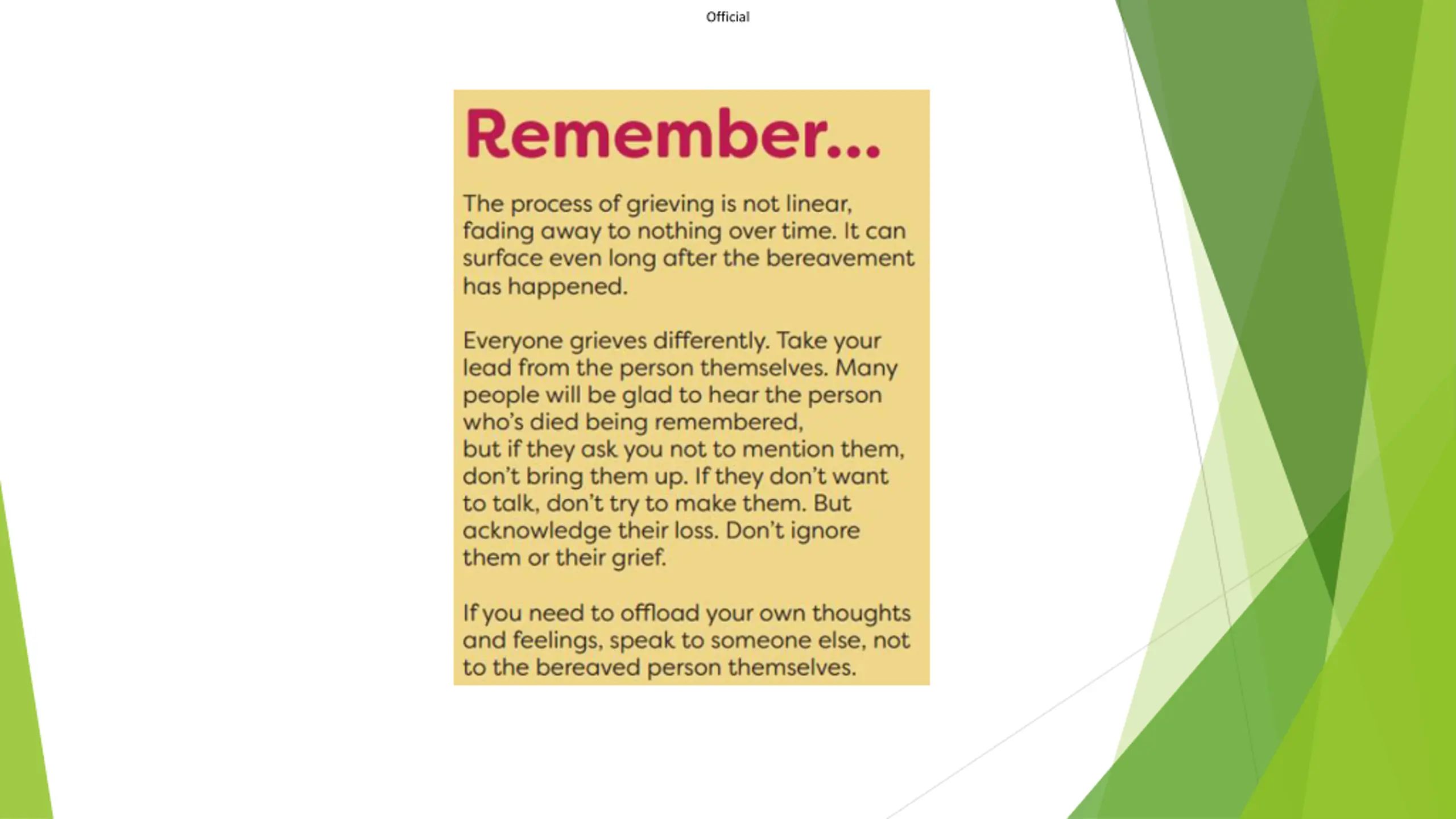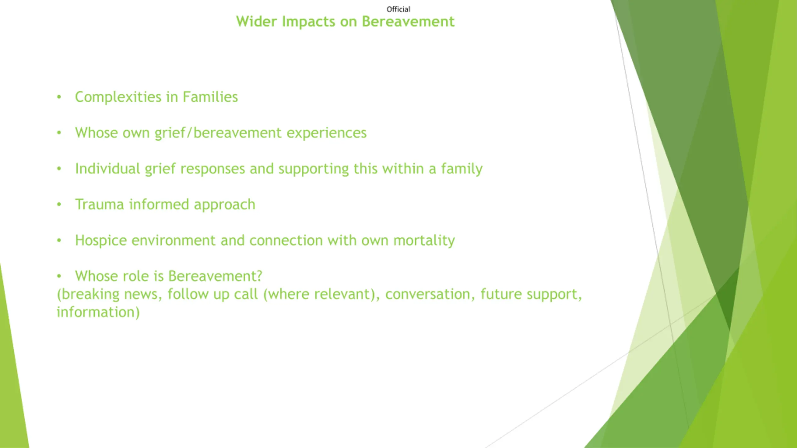 Official Wider Impacts on Bereavement Complexities in Families Whose own grief/bereavement experiences Individual grief responses and supporting this within a family Trauma informed approach Hospice environment and connection with own mortality Whose role is Bereavement? (breaking news, follow up call (where relevant), conversation, future support, information)
