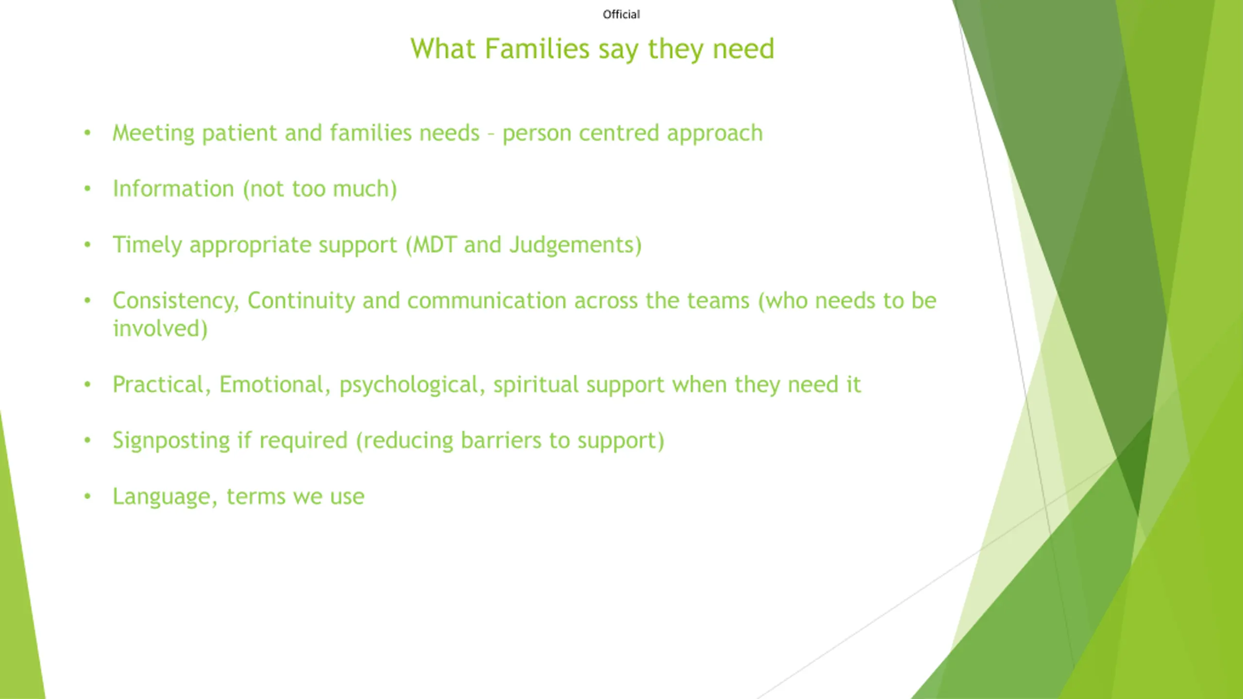 Official What Families say they need Meeting patient and families needs person centred approach Information (not too much) Timely appropriate support (MDT and Judgements) Consistency, Continuity and communication across the teams (who needs to be involved) Practical, Emotional, psychological, spiritual support when they need it Signposting if required (reducing barriers to support) Language, terms we use