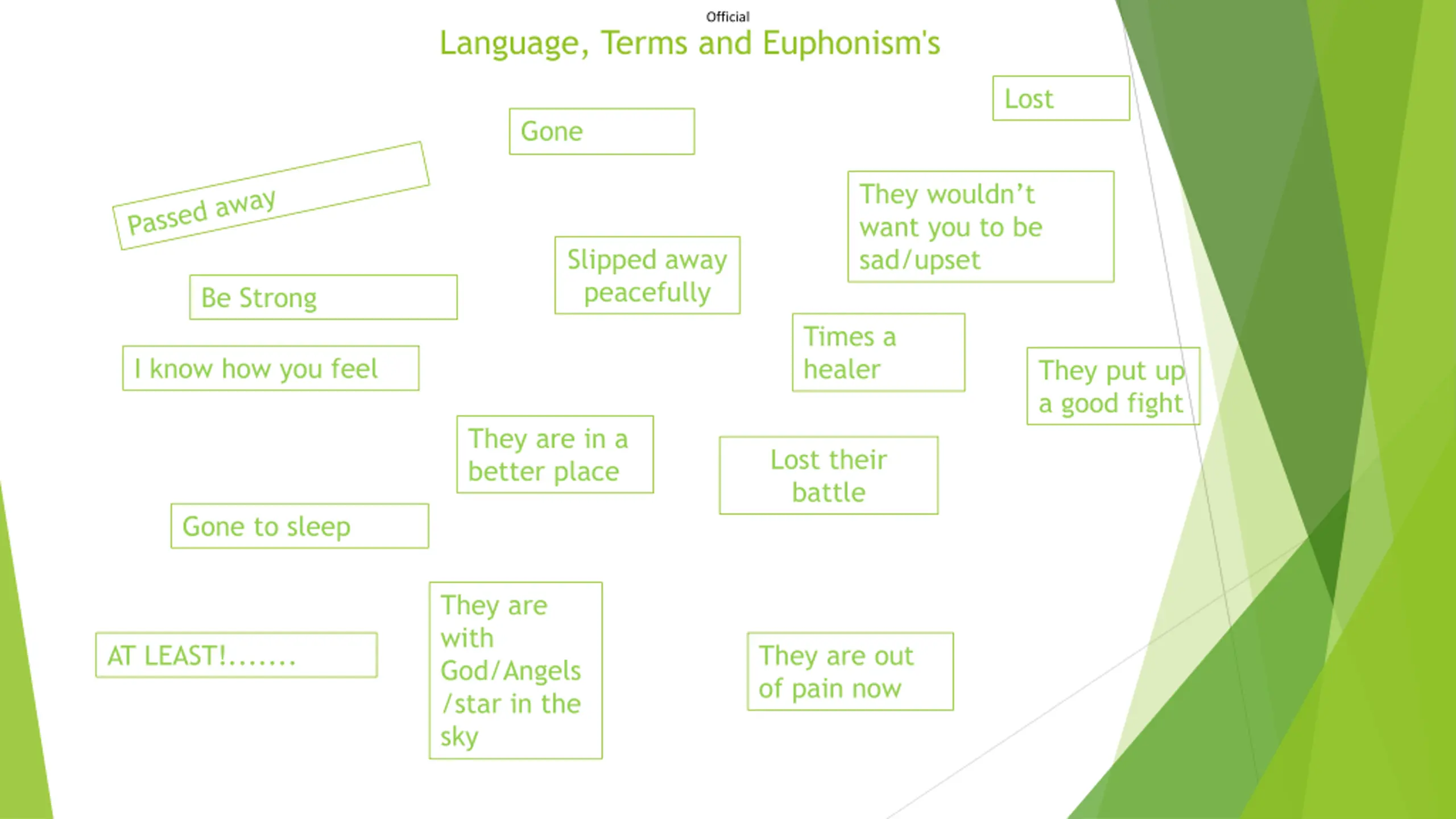 Official Language, Terms and Euphonism's Lost Gone They wouldn t want you to be sad/upset Slipped away peacefully Be Strong Times a healer I know how you feel They put up a good fight They are in a better place Lost their battle Gone to sleep They are with God/Angels /star in the sky AT LEAST!....... They are out of pain now