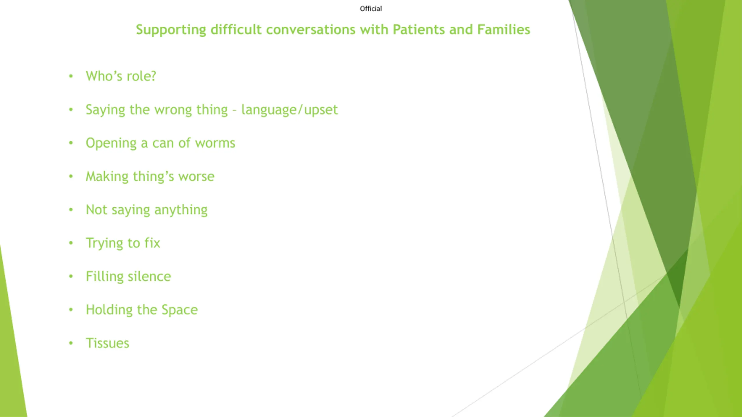 Official Supporting difficult conversations with Patients and Families Who s role? Saying the wrong thing language/upset Opening a can of worms Making thing s worse Not saying anything Trying to fix Filling silence Holding the Space Tissues