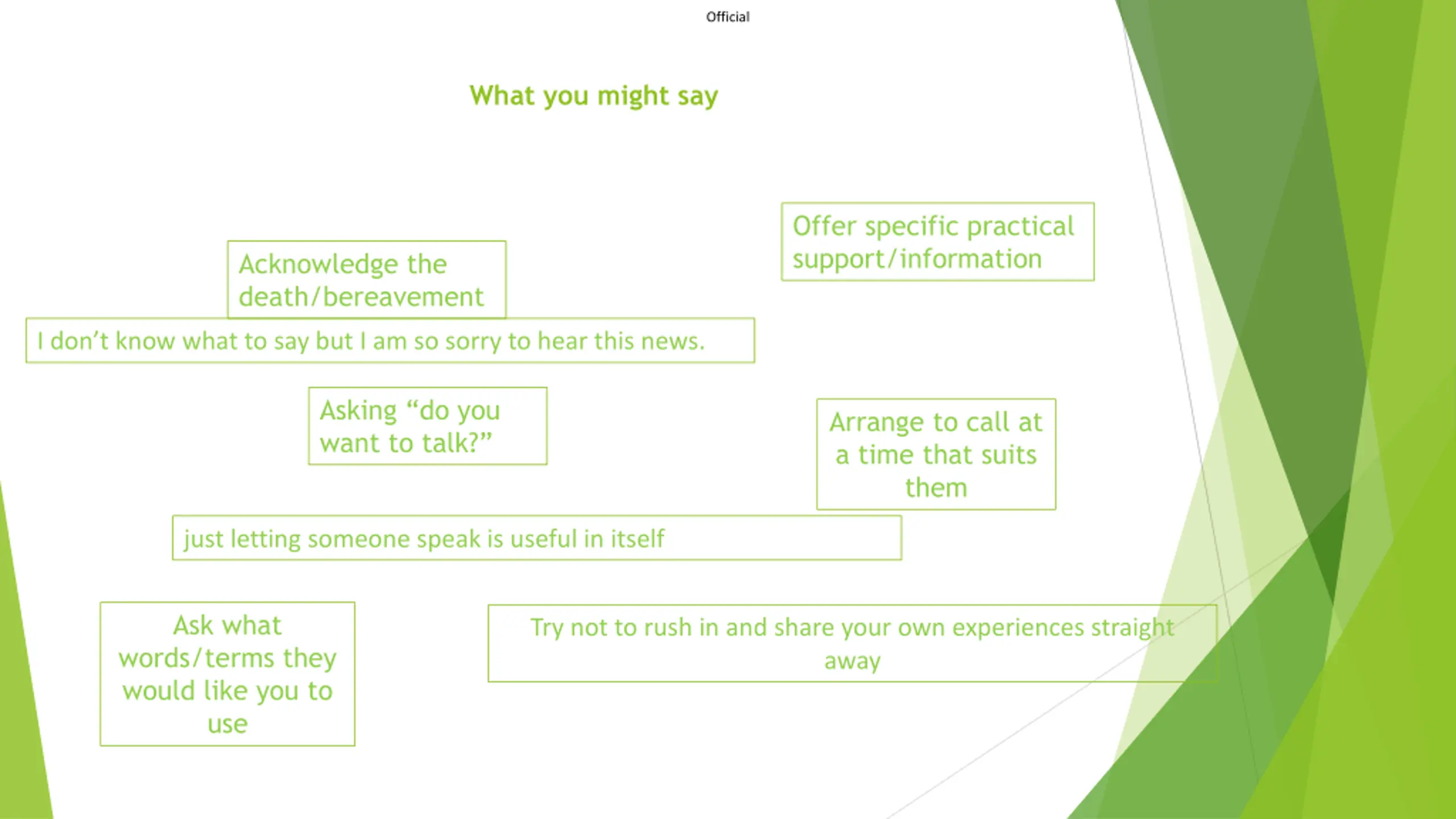 Official What you might say Offer specific practical support/information Acknowledge the death/bereavement I don t know what to say but I am so sorry to hear this news. Asking do you want to talk? Arrange to call at a time that suits them just letting someone speak is useful in itself Ask what words/terms they would like you to use Try not to rush in and share your own experiences straight away