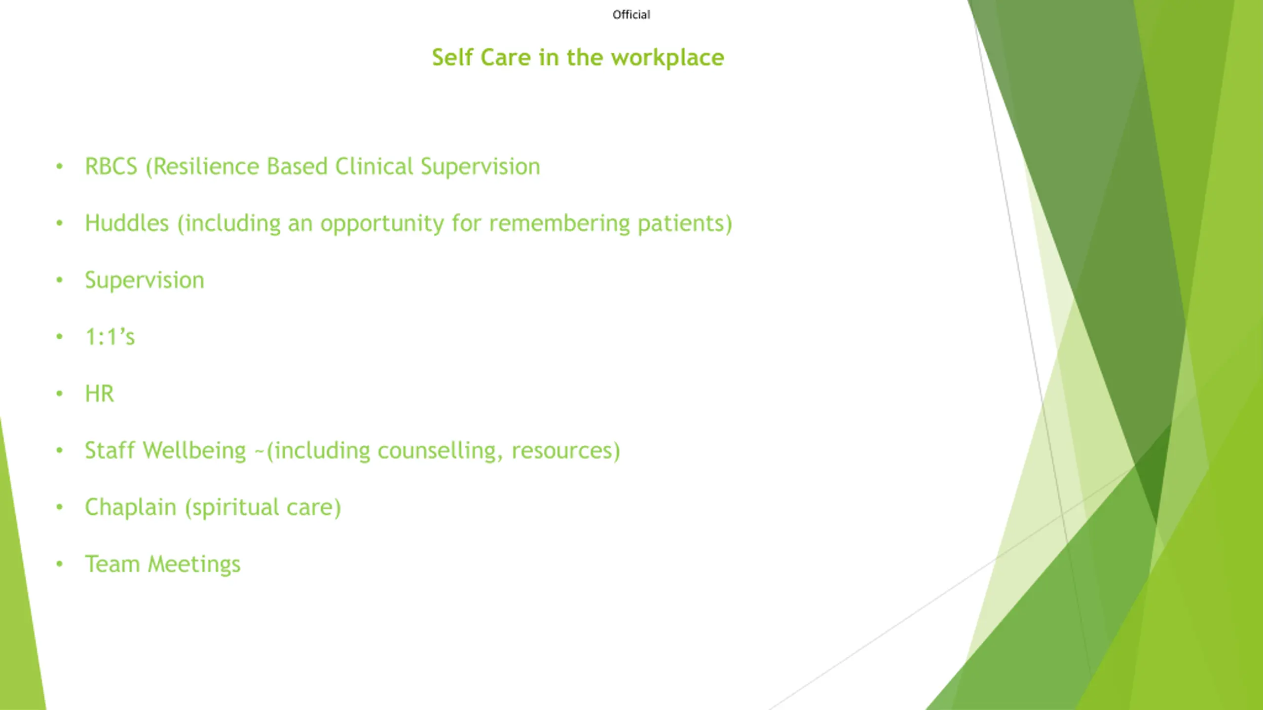 Official Self Care in the workplace RBCS (Resilience Based Clinical Supervision Huddles (including an opportunity for remembering patients) Supervision 1:1 s HR Staff Wellbeing ~(including counselling, resources) Chaplain (spiritual care) Team Meetings
