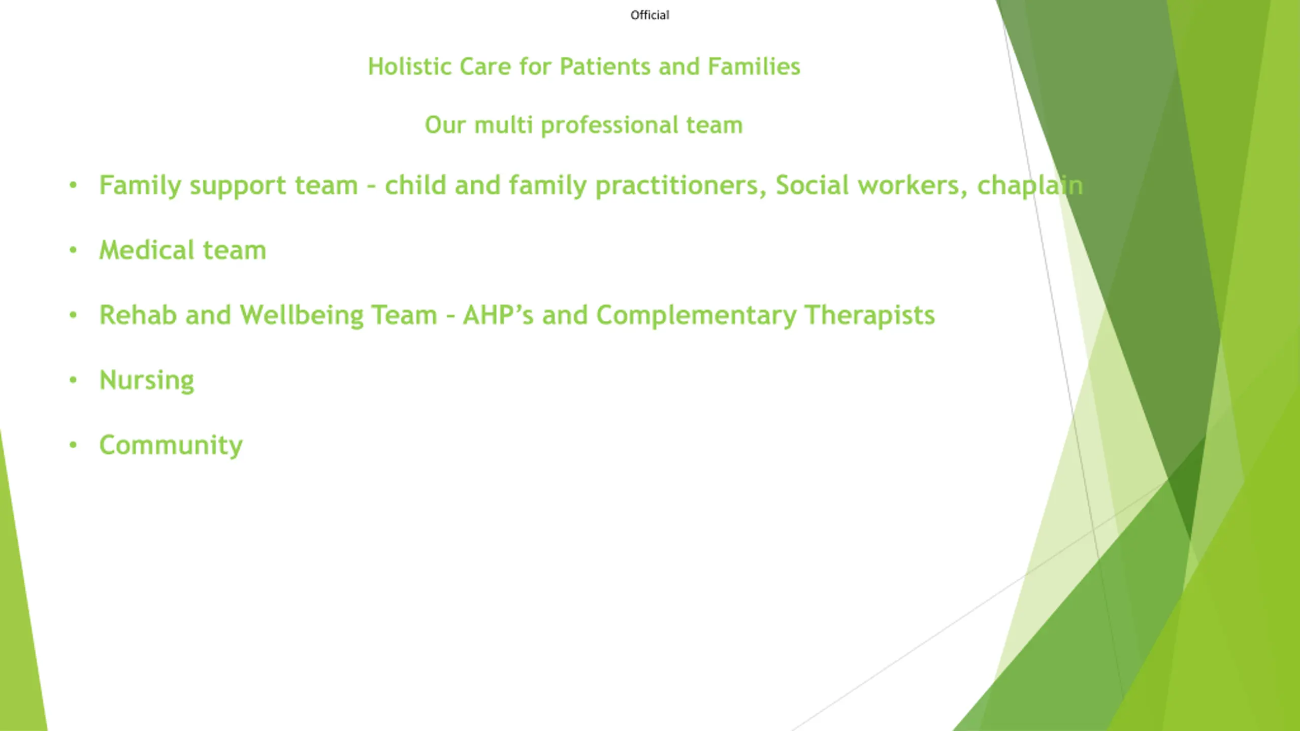 Official Holistic Care for Patients and Families Our multi professional team Family support team child and family practitioners, Social workers, chaplain Medical team Rehab and Wellbeing Team AHP s and Complementary Therapists Nursing Community