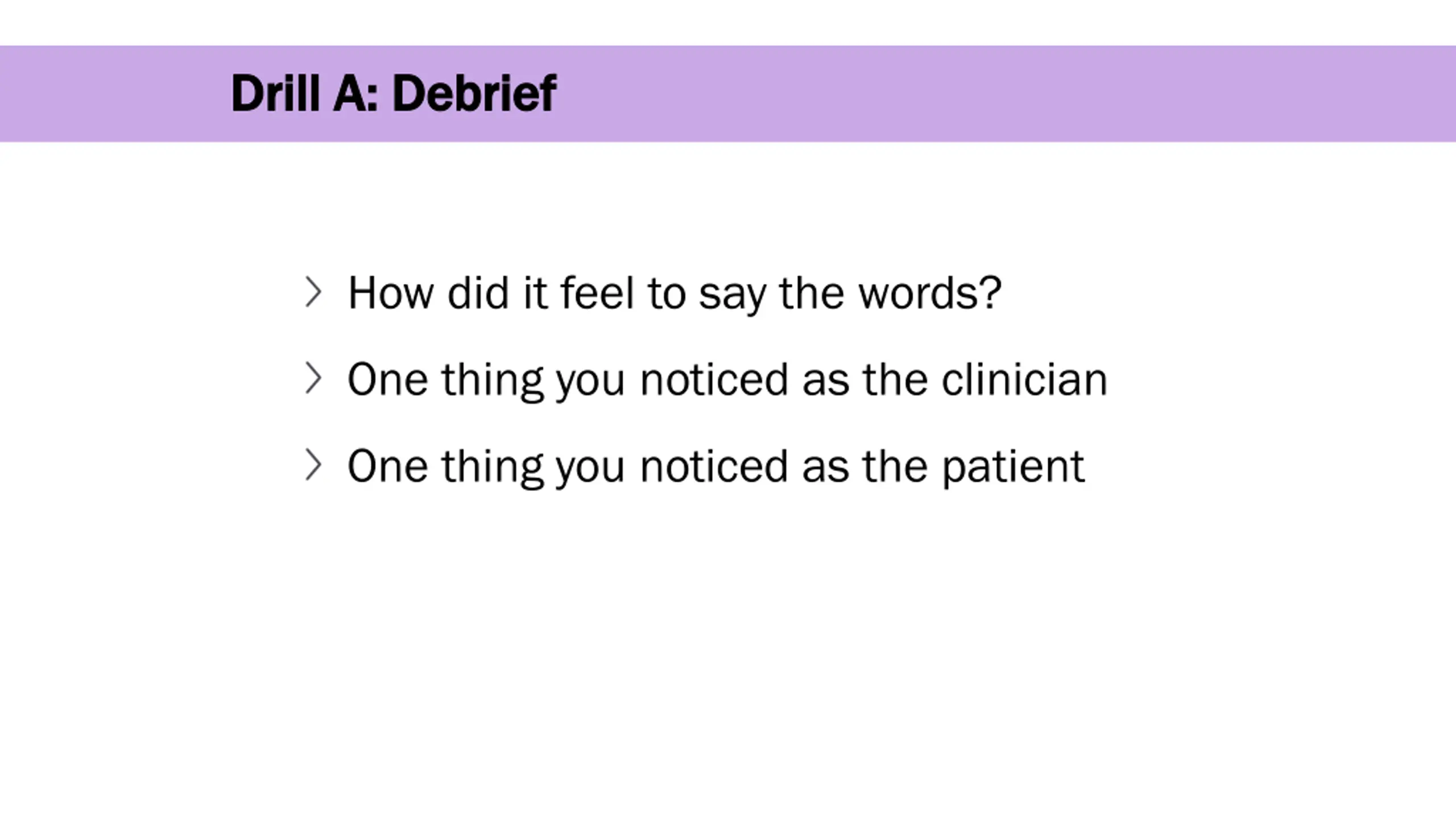 Drill A: Debrief Drill A: Debrief How did it feel to say the words? One thing you noticed as the clinician One thing you noticed as the patient