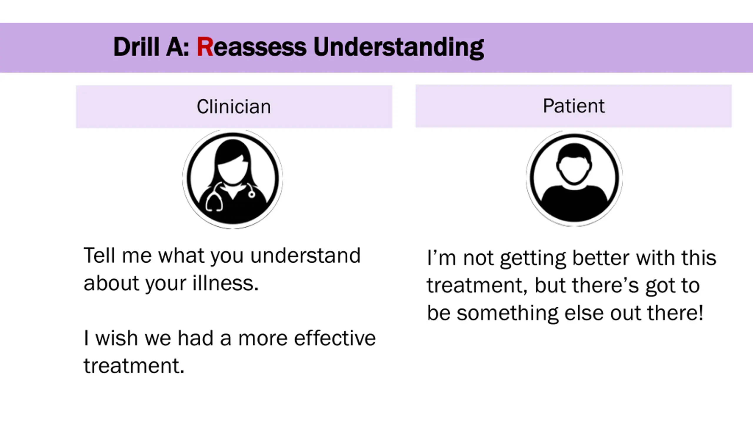 Drill A: Drill A: R Reassess Understanding eassess Understanding Patient Clinician Tell me what you understand about your illness. I m not getting better with this treatment, but there s got to be something else out there! I wish we had a more effective treatment.
