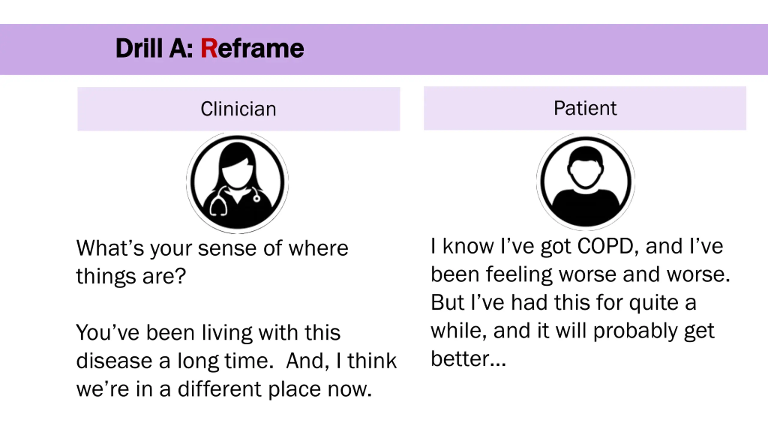 Drill A: Drill A: R Reframe eframe Patient Clinician I know I ve got COPD, and I ve been feeling worse and worse. But I ve had this for quite a while, and it will probably get better What s your sense of where things are? You ve been living with this disease a long time. And, I think we re in a different place now.