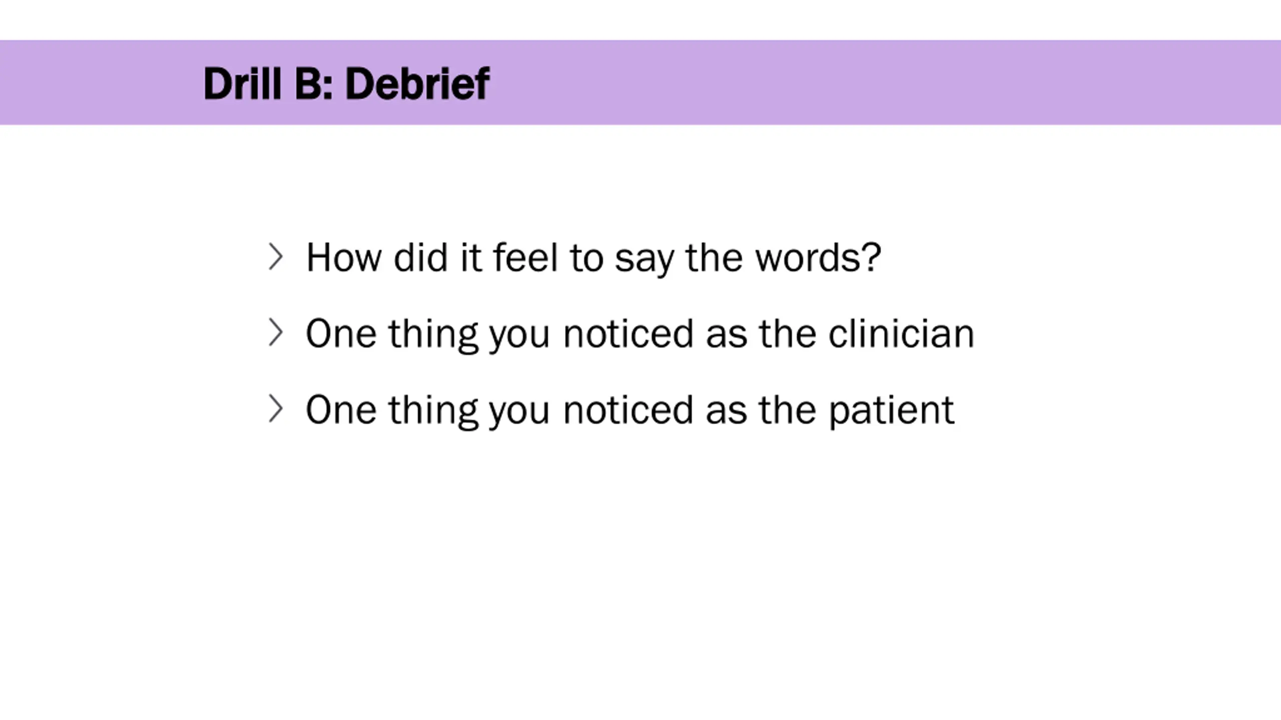 Drill B: Debrief Drill B: Debrief How did it feel to say the words? One thing you noticed as the clinician One thing you noticed as the patient