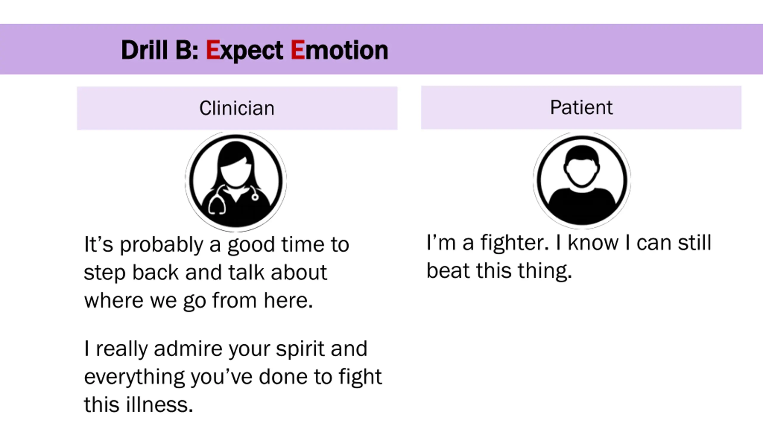 Drill B: Drill B: E Expect xpect E Emotion motion Patient Clinician I m a fighter. I know I can still beat this thing. It s probably a good time to step back and talk about where we go from here. I really admire your spirit and everything you ve done to fight this illness.