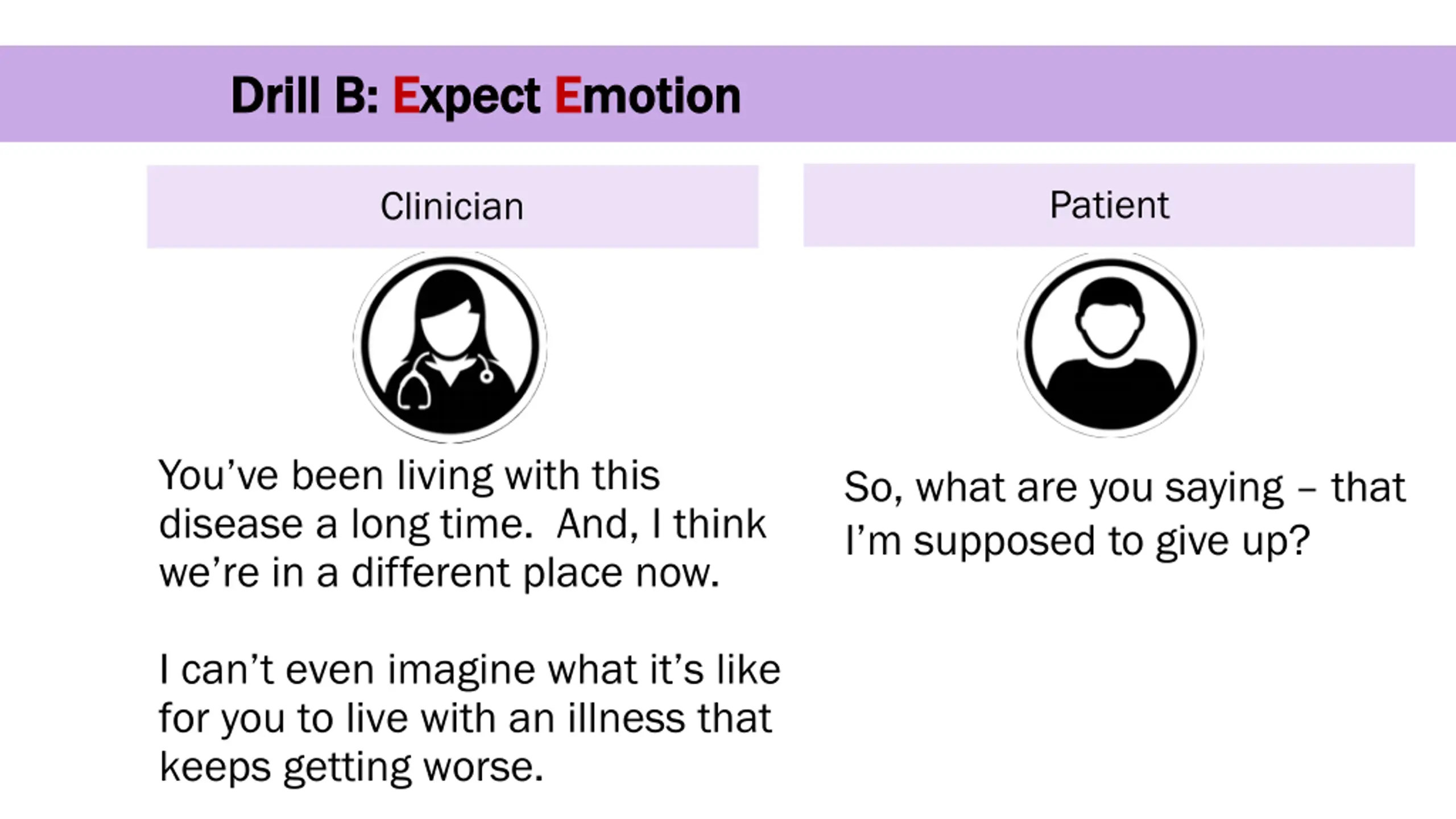 Drill B: Drill B: E Expect xpect E Emotion motion Patient Clinician You ve been living with this disease a long time. And, I think we re in a different place now. So, what are you saying that I m supposed to give up? I can t even imagine what it s like for you to live with an illness that keeps getting worse.