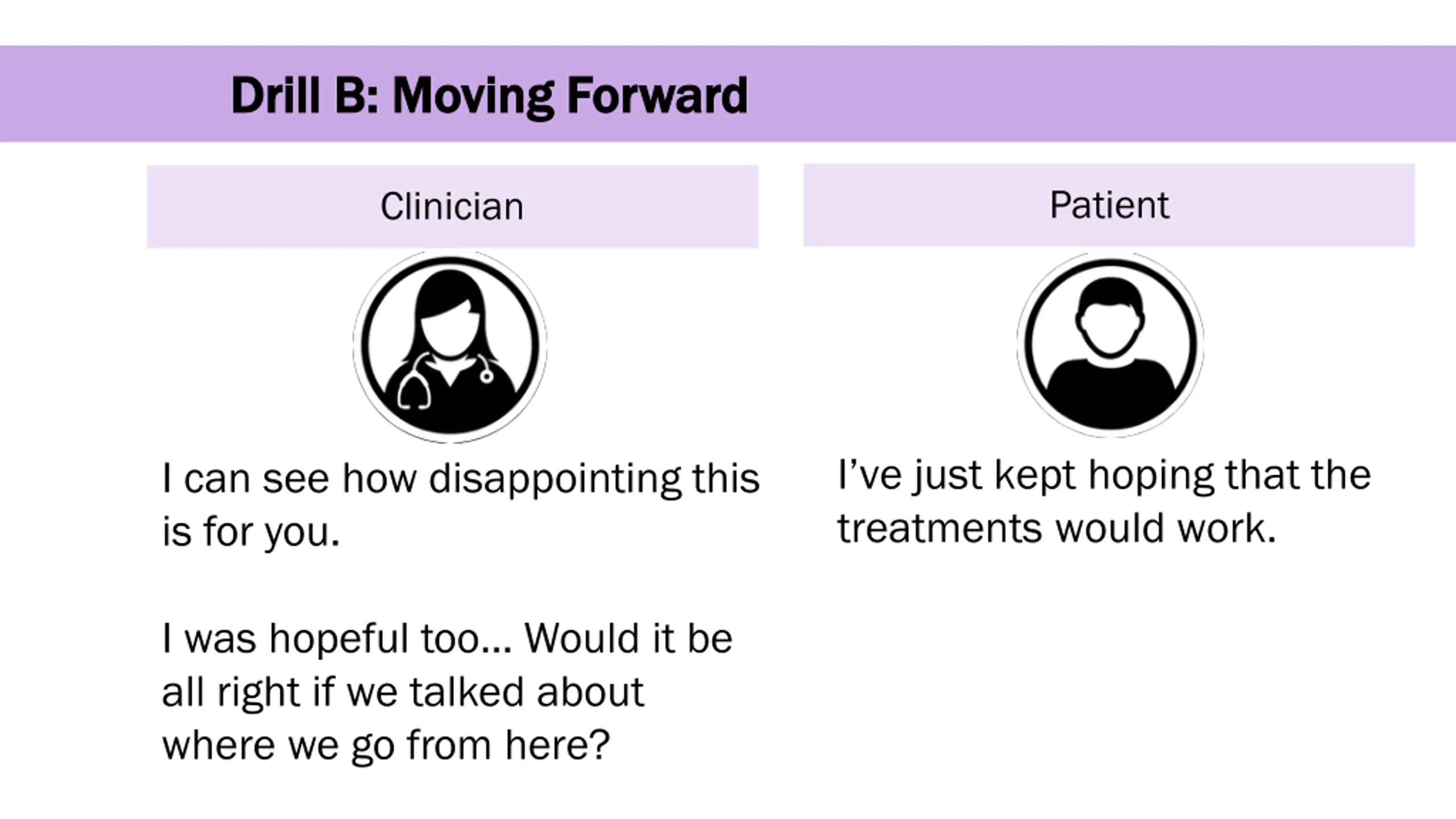 Drill B: Moving Forward Drill B: Moving Forward Patient Clinician I ve just kept hoping that the treatments would work. I can see how disappointing this is for you. I was hopeful too Would it be all right if we talked about where we go from here?