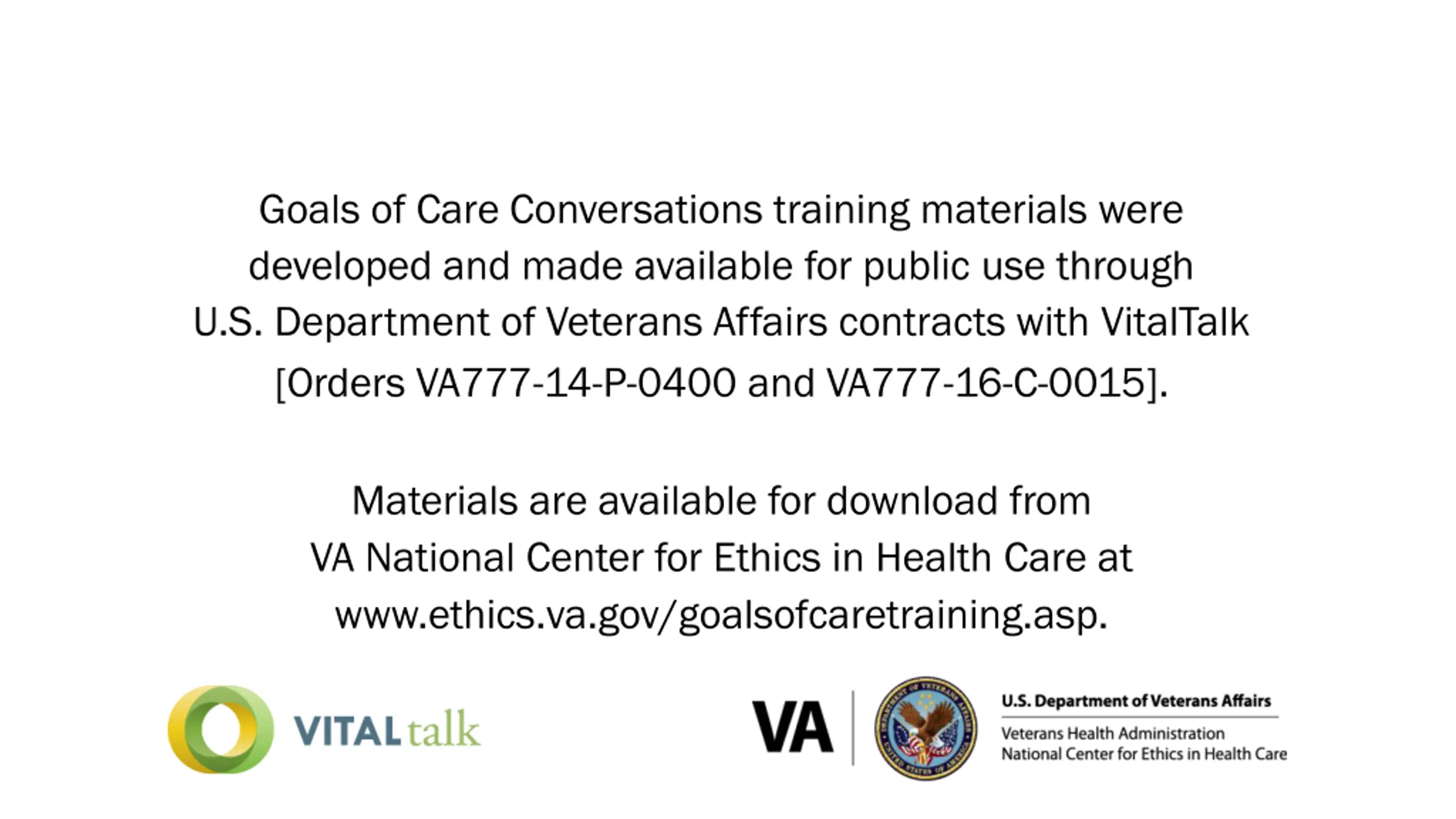 Goals of Care Conversations Goals of Care Conversations training materials were developed and made available for public use through U.S. Department of Veterans Affairs contracts with VitalTalk [Orders VA777-14-P-0400 and VA777-16-C-0015]. Materials are available for download from VA National Center for Ethics in Health Care at www.ethics.va.gov/goalsofcaretraining.asp.