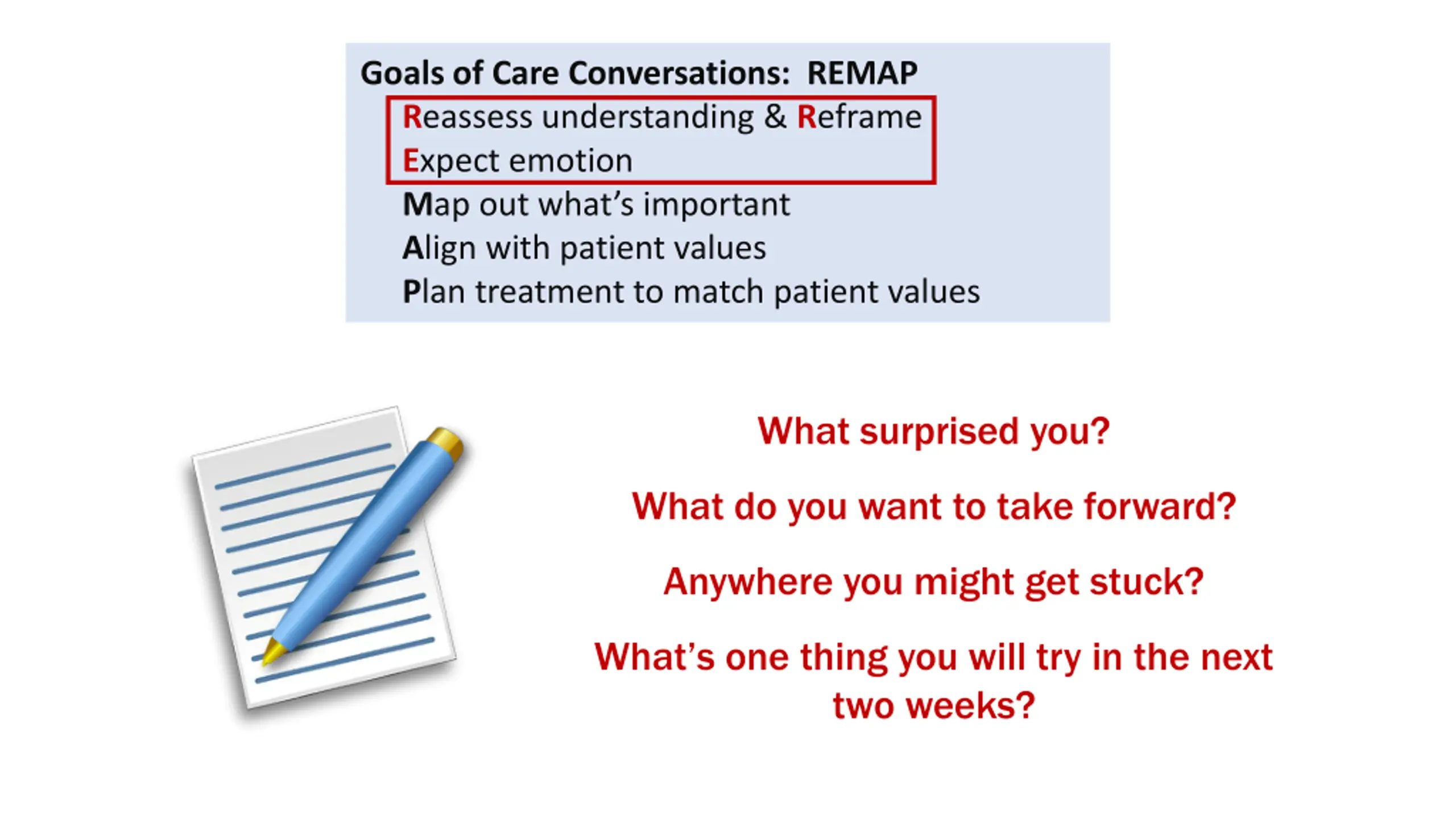 Goals of Care Conversations: REMAP Reassess understanding & Reframe Expect emotion Map out what s important Align with patient values Plan treatment to match patient values What surprised you? What do you want to take forward? Anywhere you might get stuck? What s one thing you will try in the next two weeks?