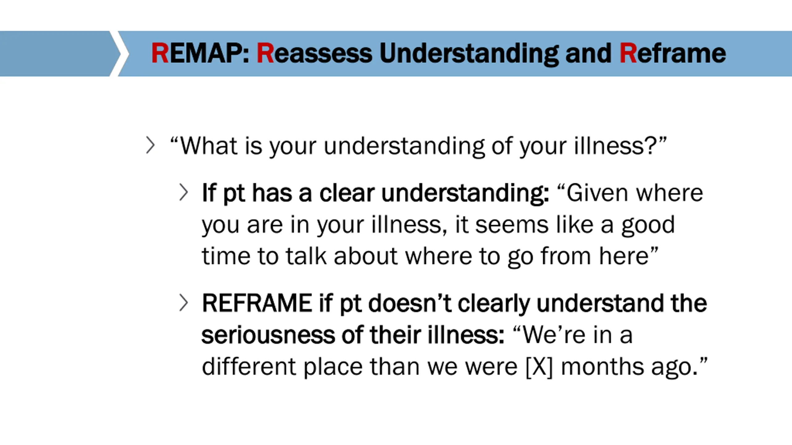 R REMAP: EMAP: R Reassess Understanding and eassess Understanding and R Reframe eframe What is your understanding of your illness? If If pt pt has a clear understanding: has a clear understanding: Given where you are in your illness, it seems like a good time to talk about where to go from here REFRAME if REFRAME if pt pt doesn t clearly understand the doesn t clearly understand the seriousness of their illness: seriousness of their illness: We re in a different place than we were [X] months ago.